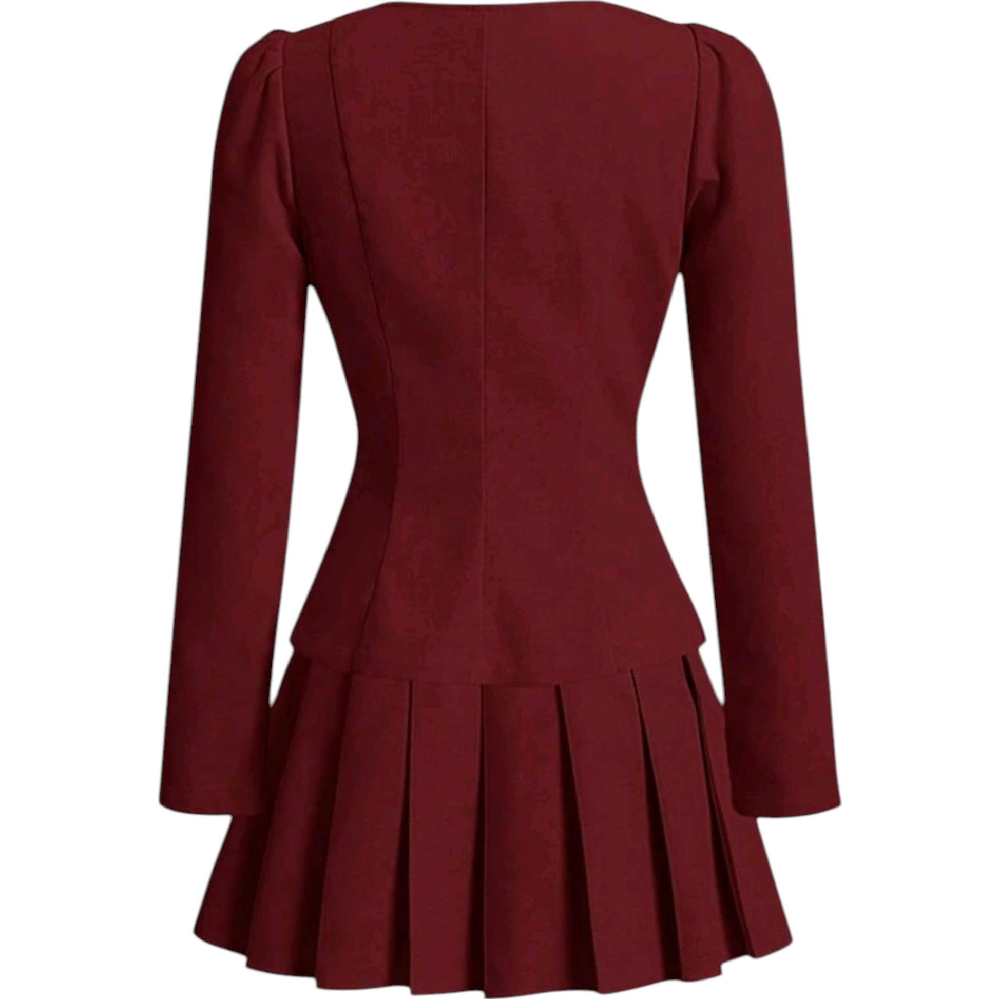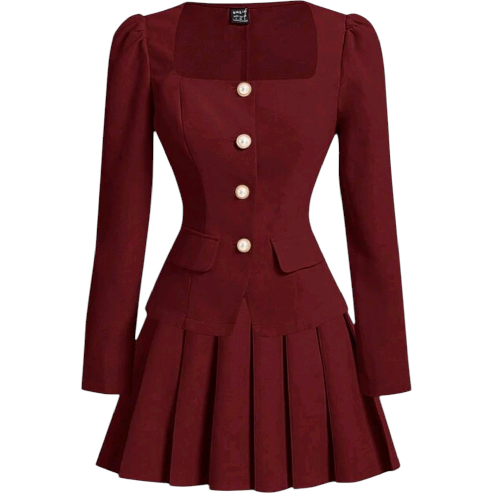 Címke nélküli, bordó, gombos, pliszé szoknyás, hosszú ujjú, A-vonalú