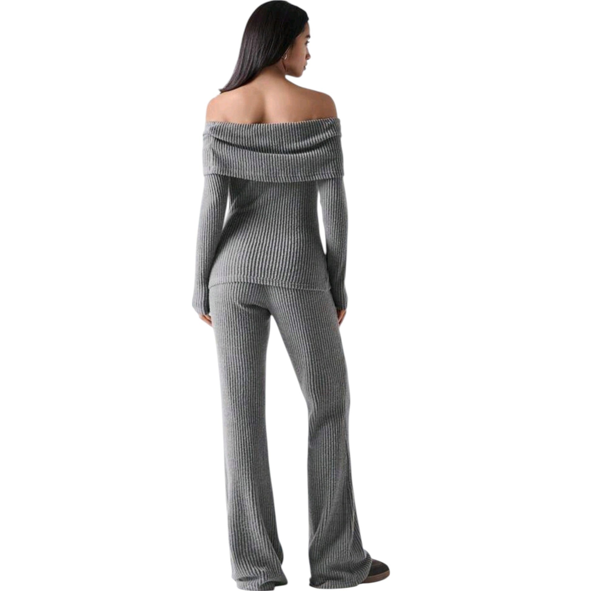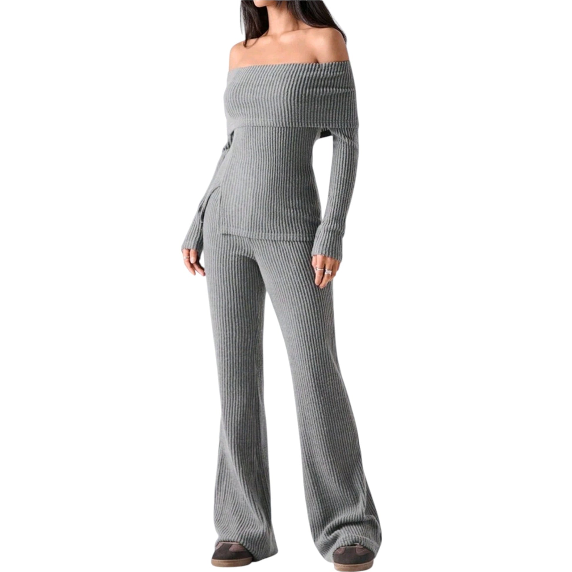 Címke nélküli, szürke, bordázott, crop felső, hosszú ujjú, ejtett vállú, hozzáillő magas derekú, bő szárú nadrág.