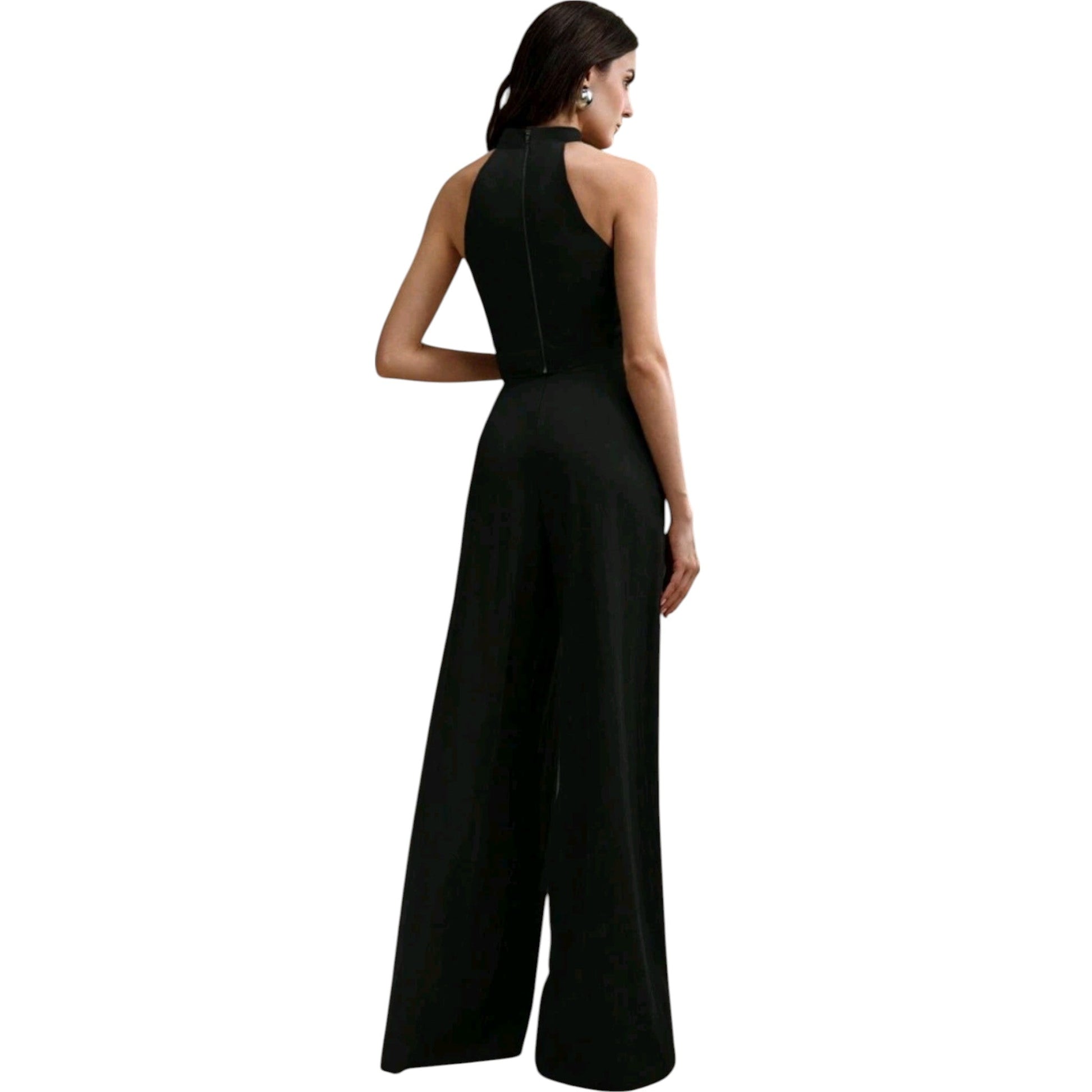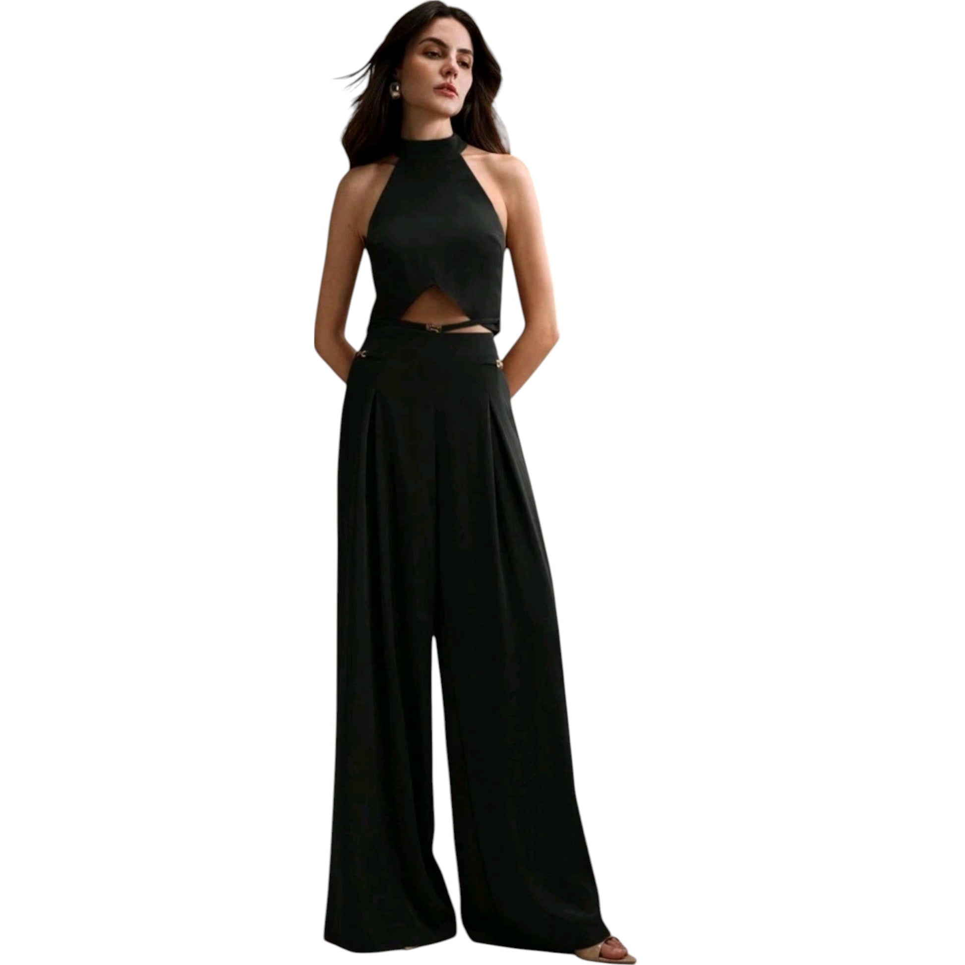 Címke nélküli, fekete, halter nyakú, kivágott derék, széles szárú nadrág.