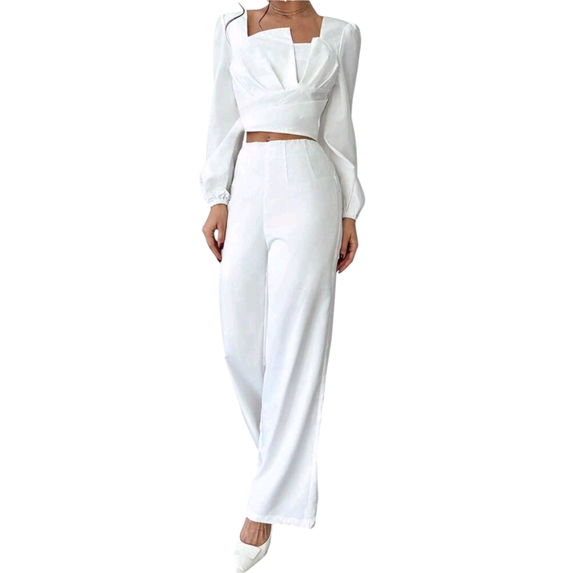 Címke nélküli, fehér, négyzetnyakú, hosszú puffos ujjú, crop felső, hozzáillő magas derekú, bő szárú nadrág.