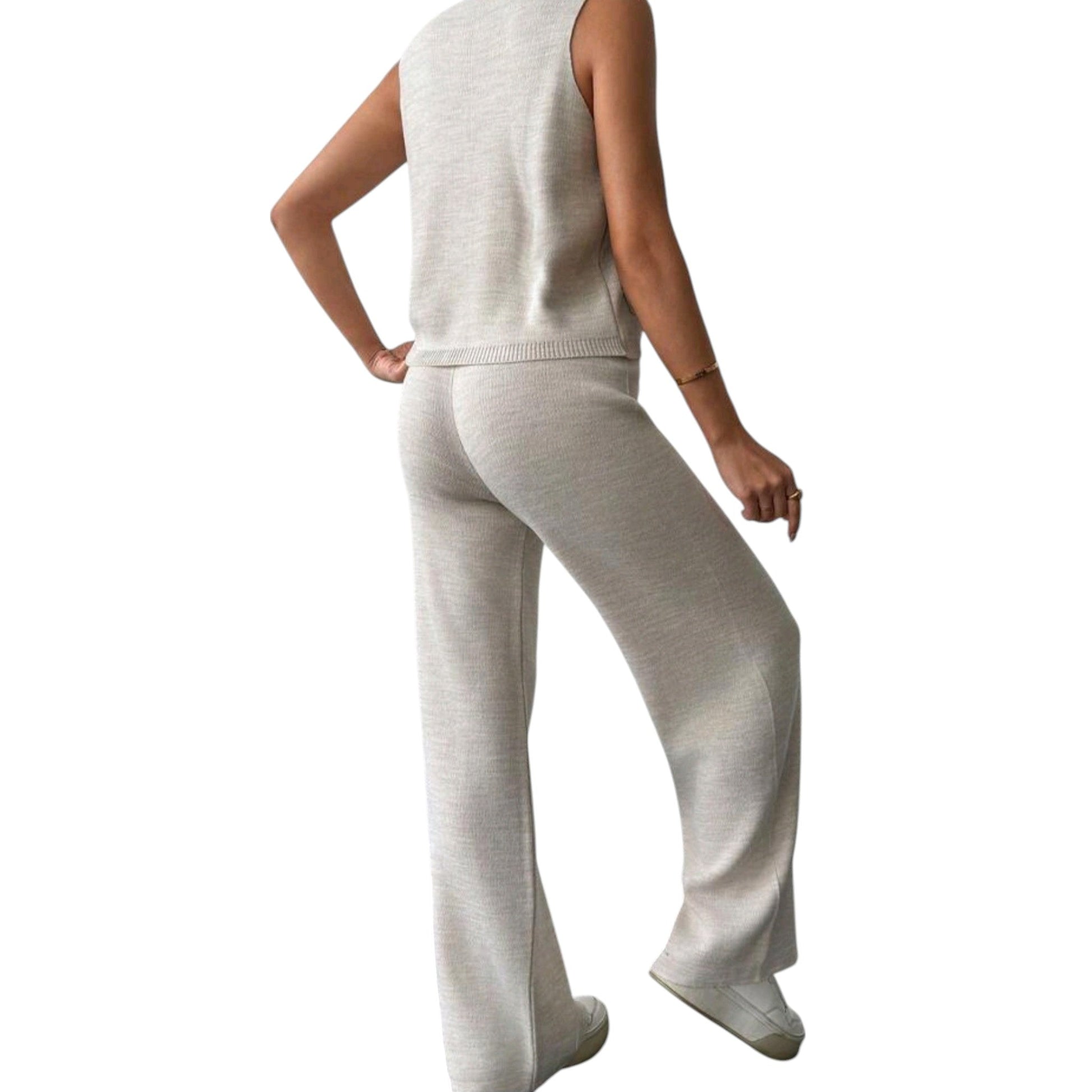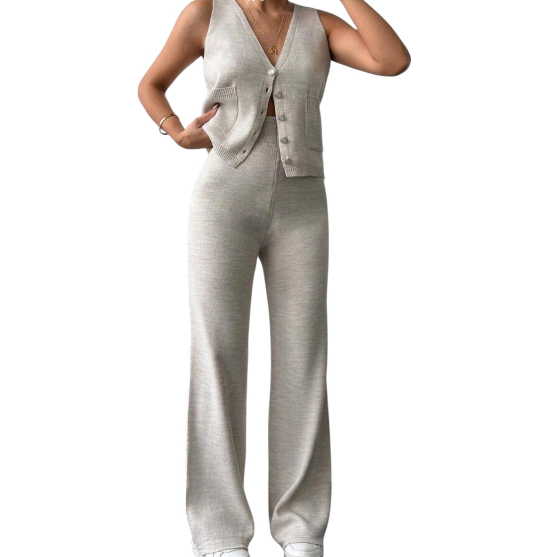 Címke nélküli, bézs, kötött, V-nyakú mellény, gombos záródás, zsebek, hozzáillő magas derekú, egyenes szárú nadrág.