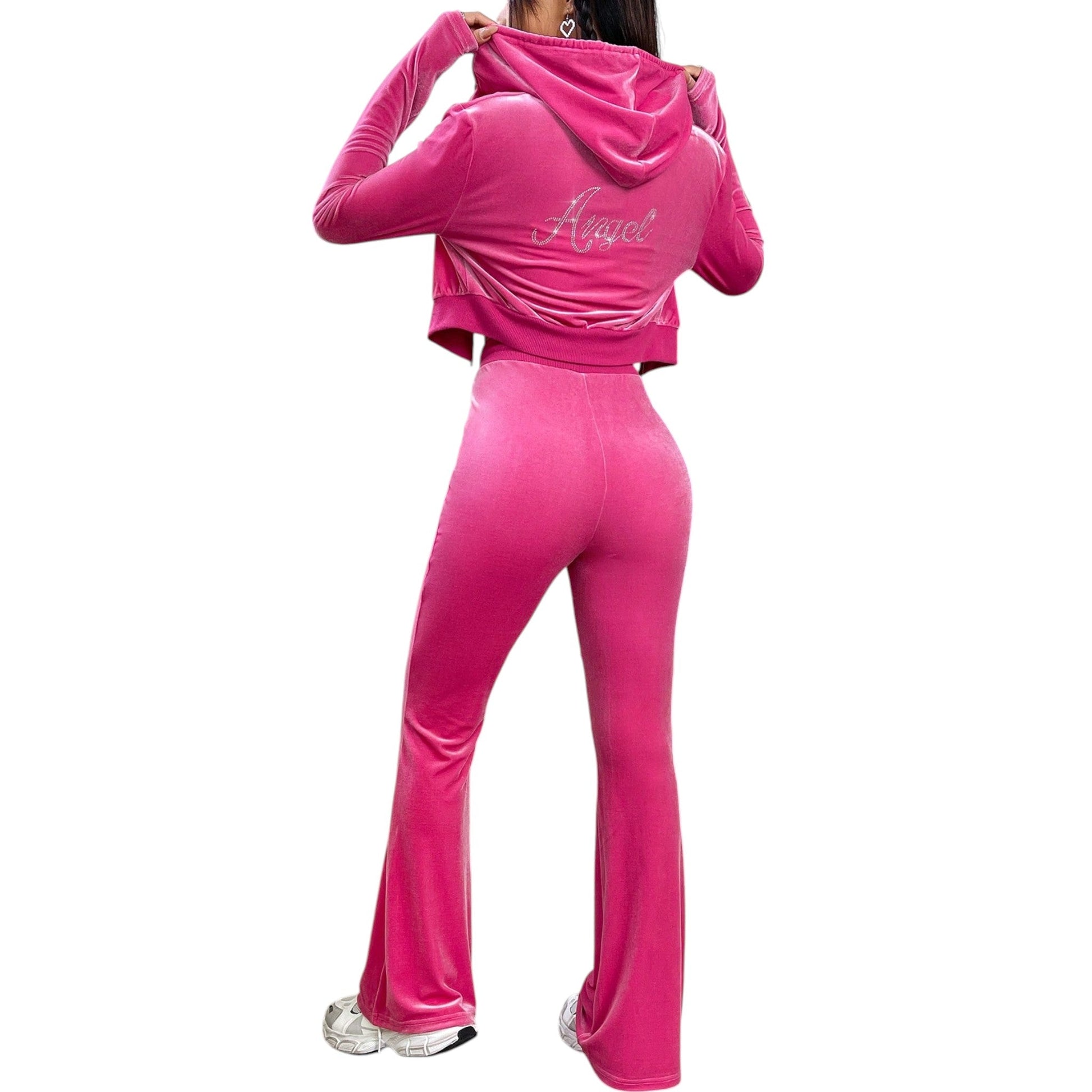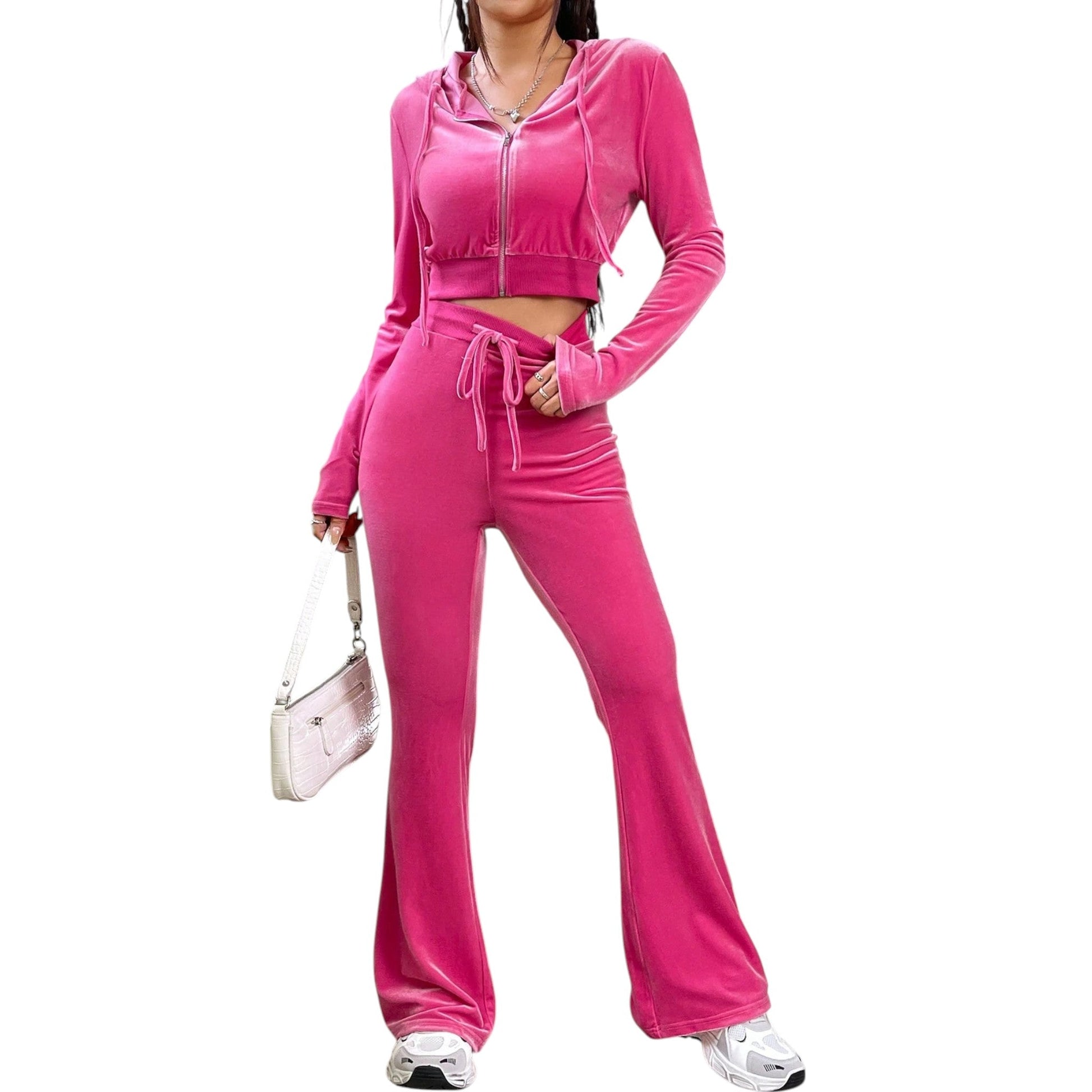 Címke nélküli, rózsaszín, bársony, kapucnis, cipzáras crop pulóver és bő szárú melegítő nadrág szett, húzott derékrésszel.