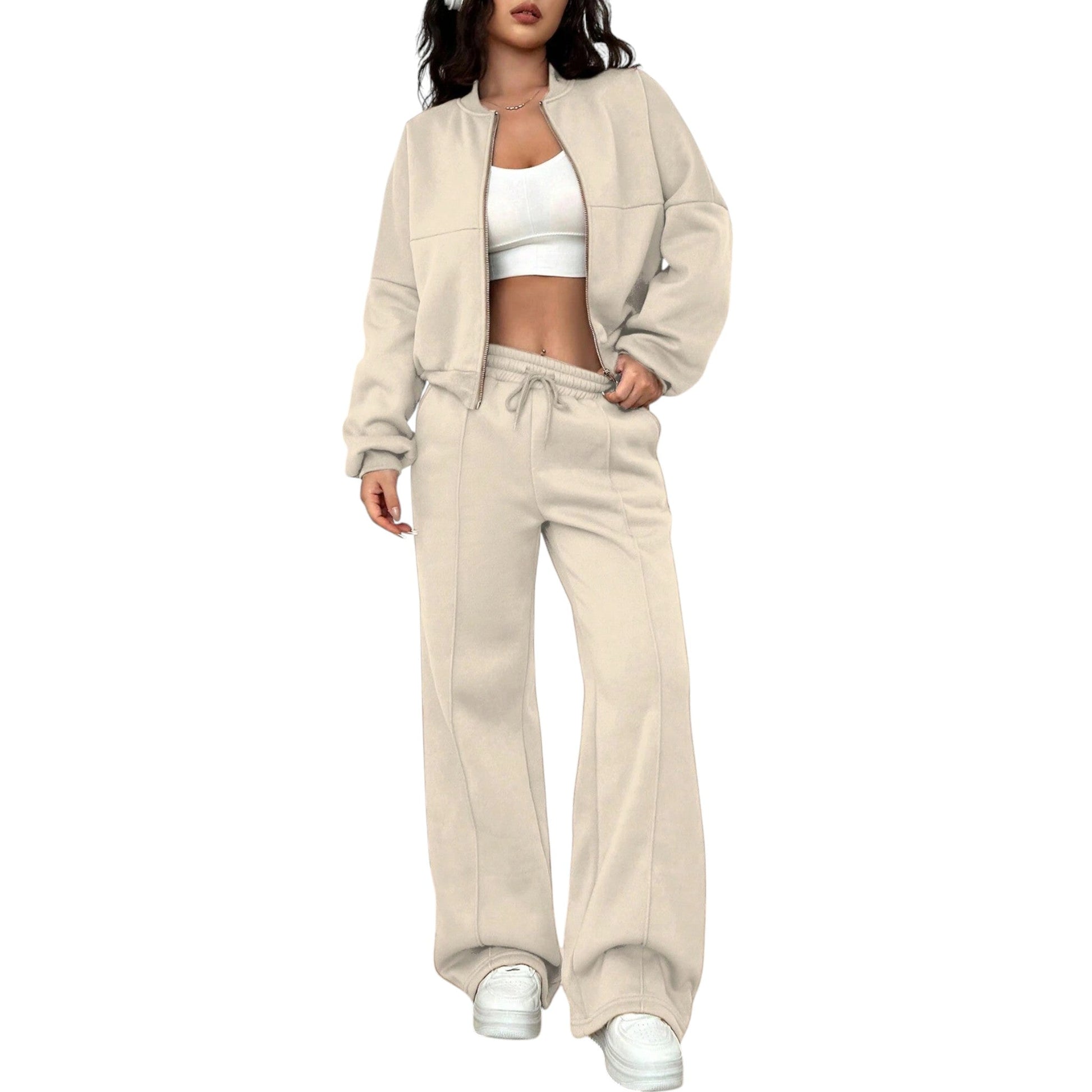 Címke nélküli, bézs, cipzáras melegítőfelső és hozzáillő bő szárú melegítőnadrág szett.