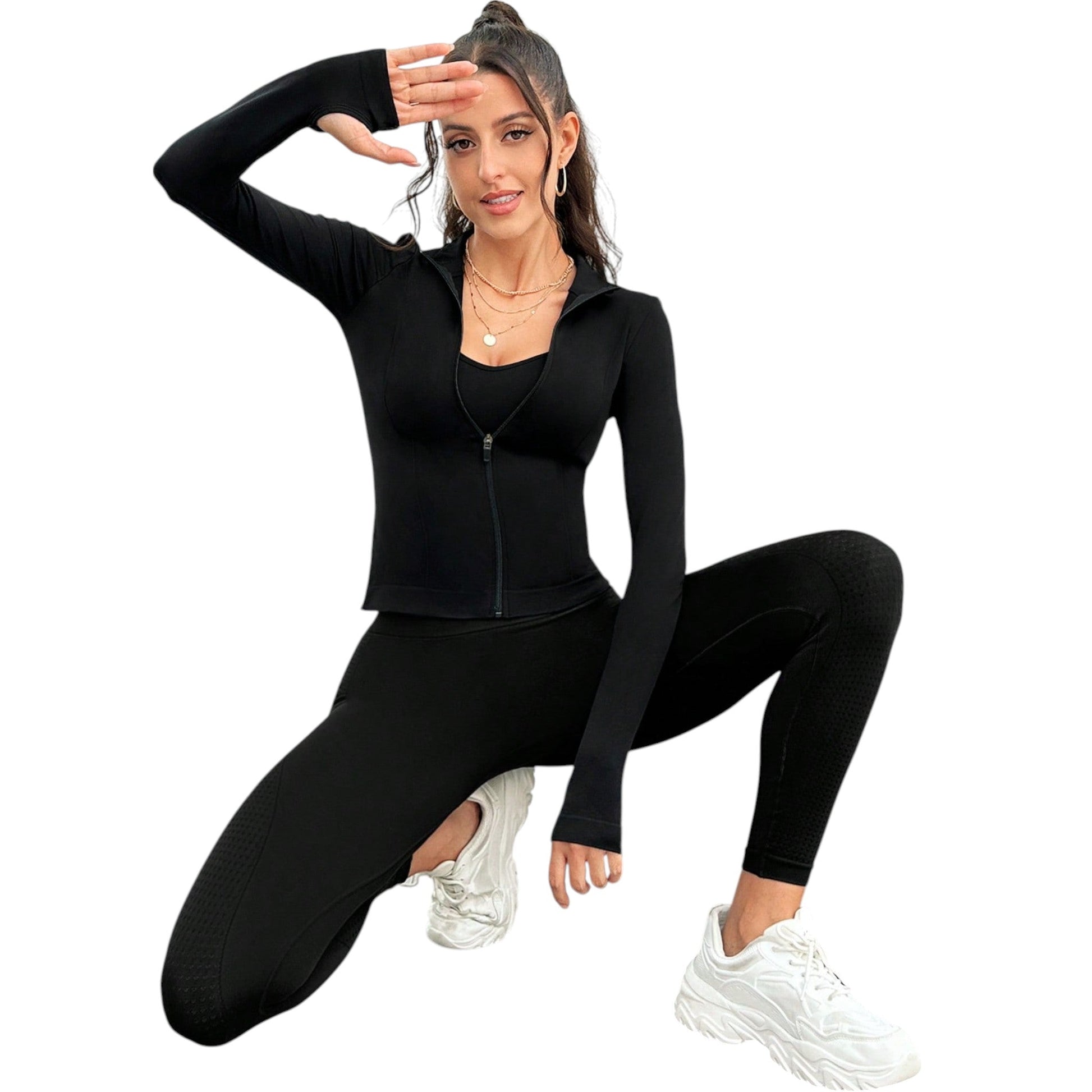 Címke nélküli, fekete színű sportruházat szett. A szett tartalma: hosszú ujjú cipzáras felső, top és leggings. A felső cipzáras, álló gallérú. A leggings magas derekú.