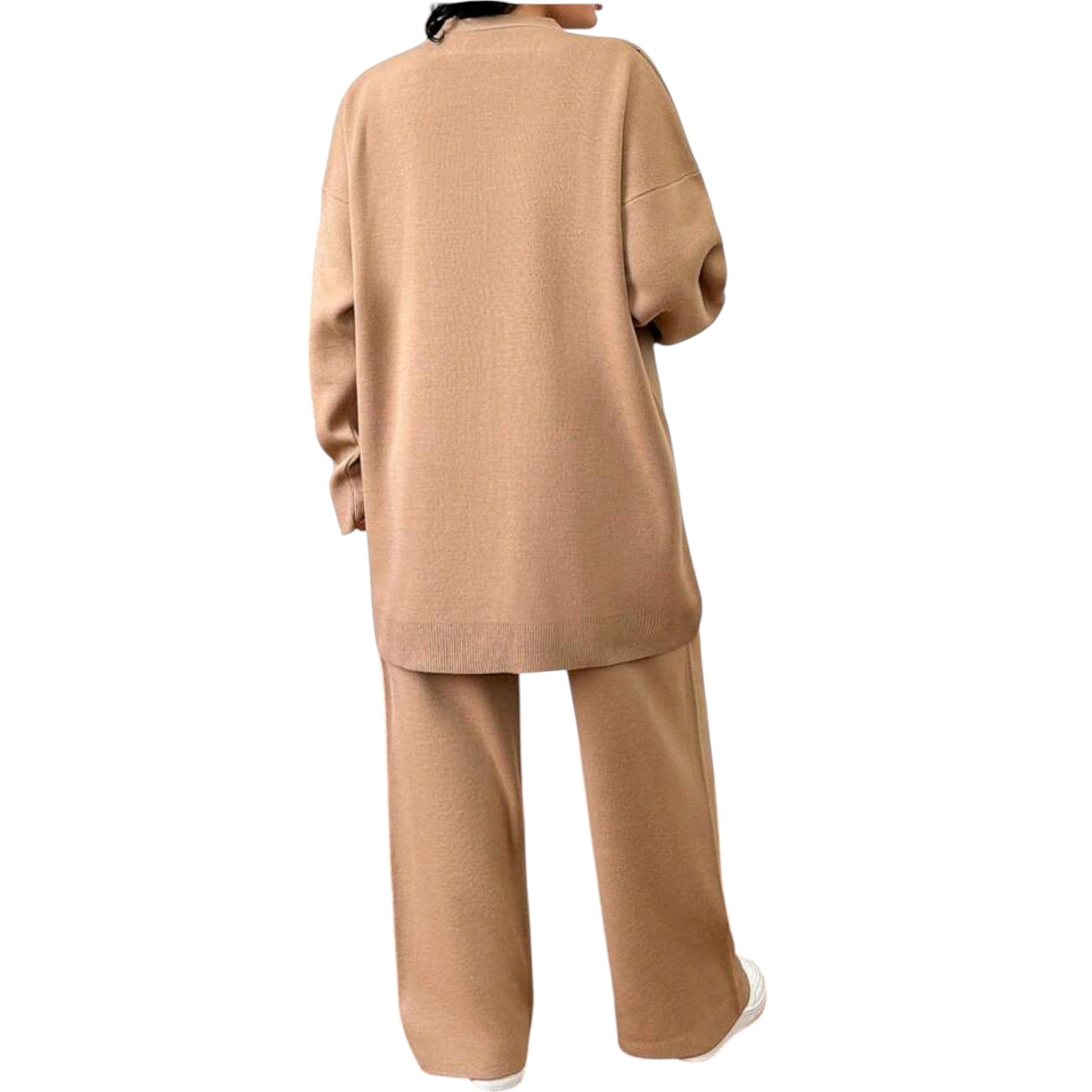 Címke nélküli, barna, kötött, hosszú ujjú felső és széles szárú nadrág szett.