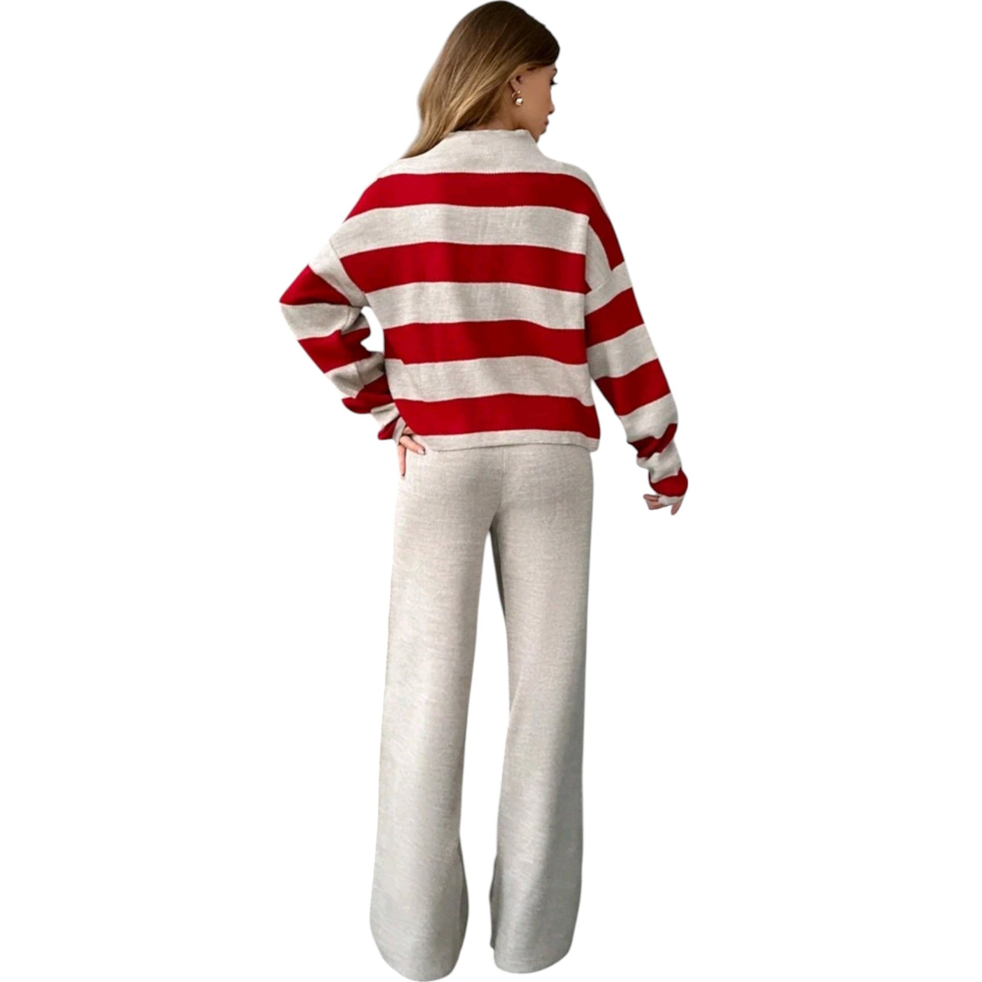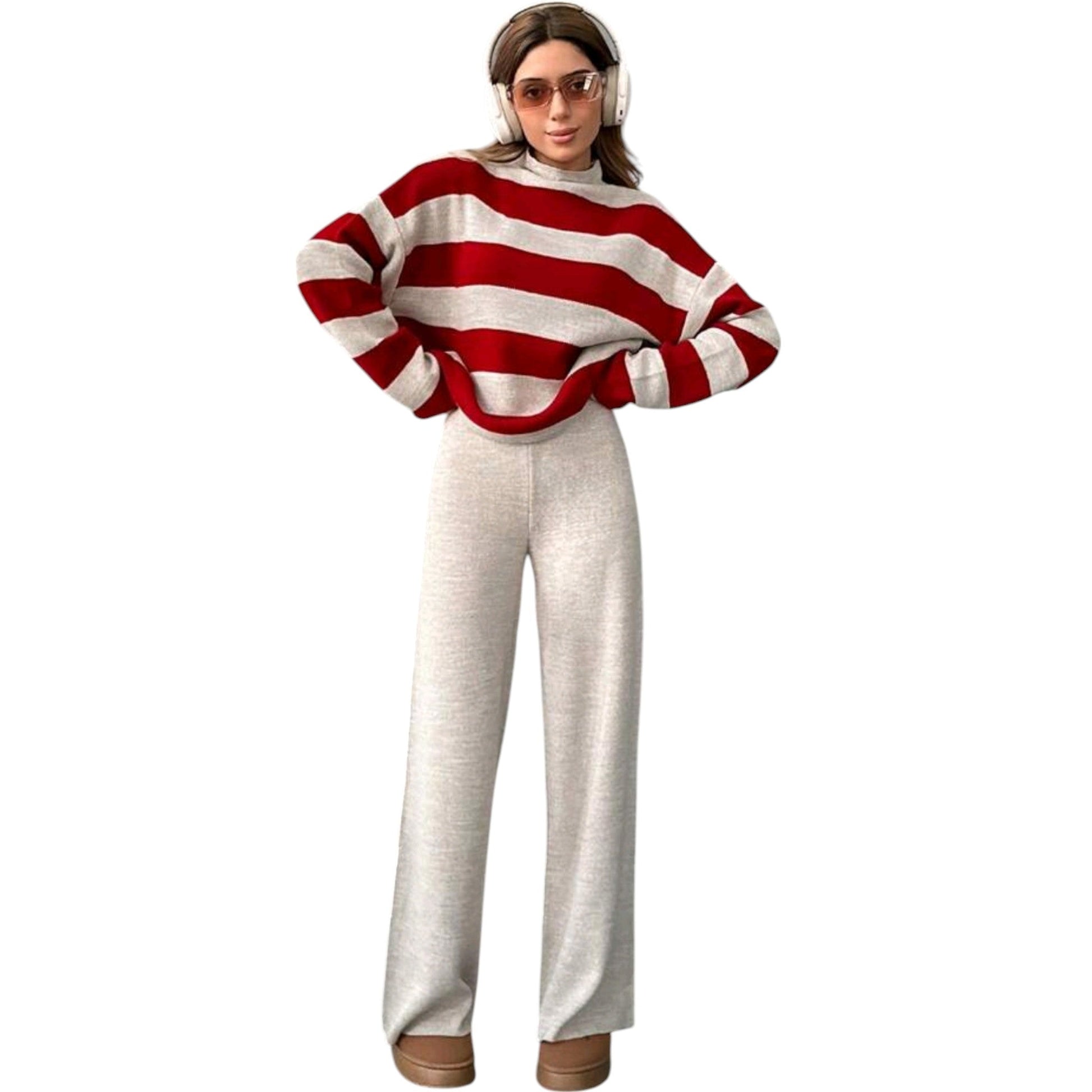 Címke nélküli, piros, hosszú ujjú, kerek nyakú, bézs csíkos pulóver hozzá illő bőszárú nadrággal