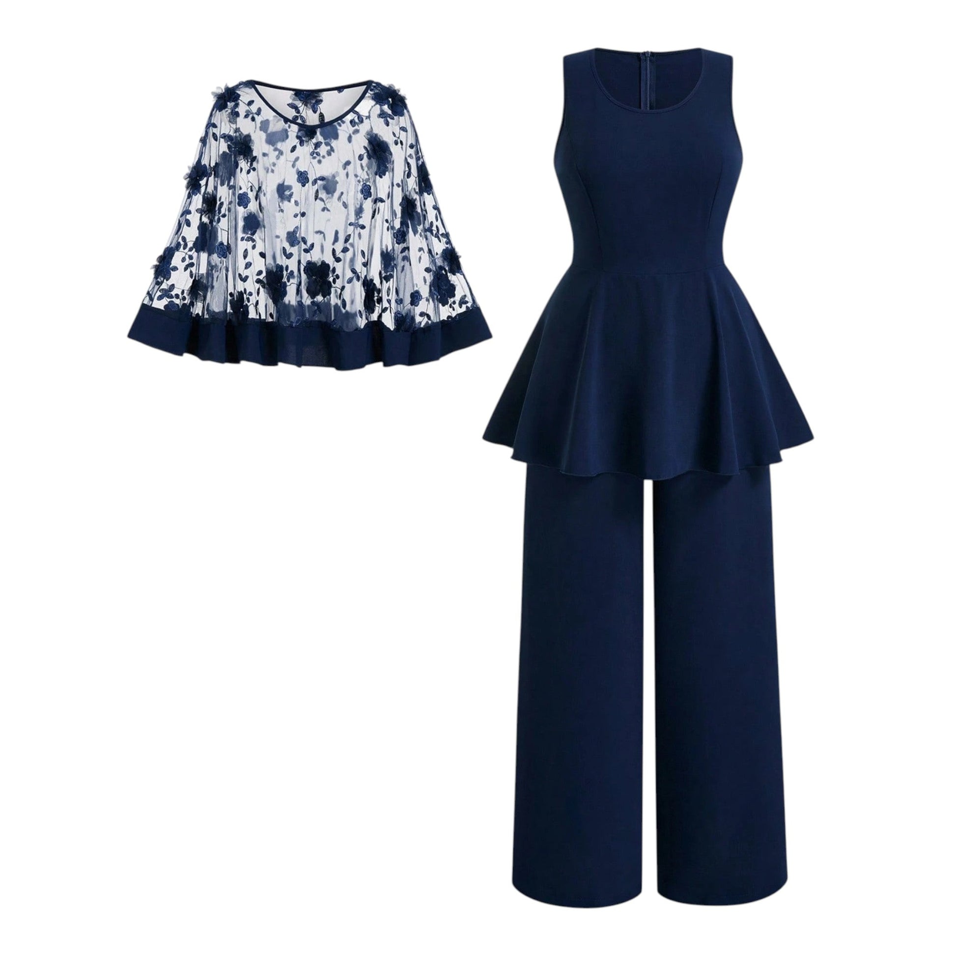 Címke nélküli, sötétkék, kétrészes szett, ujjatlan felső peplum derékkal és hosszú nadrág, valamint egy áttetsző, virágmintás poncsó jellegű felső.