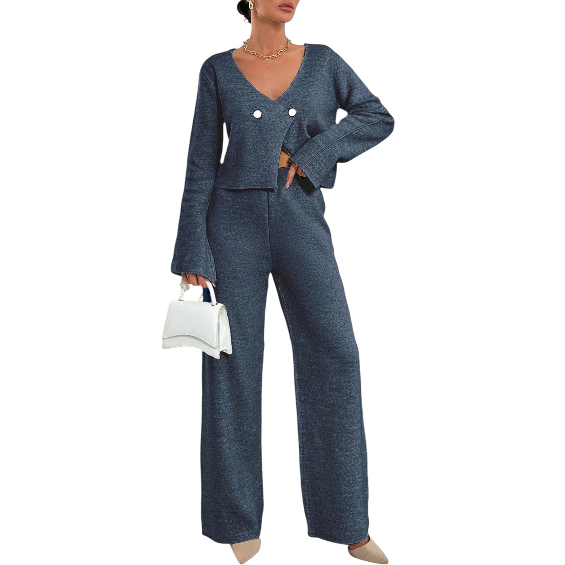 Címke nélküli, kék, kötött kétrészes szett, V-nyakú pulóver gombokkal és hosszú, egyenes szárú nadrág.