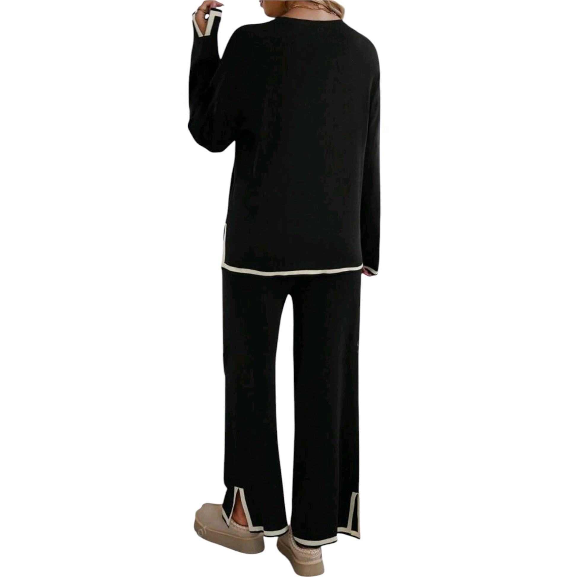 Címke nélküli, fekete, kötött, hosszú ujjú felső és nadrág szett, fehér szegéllyel.