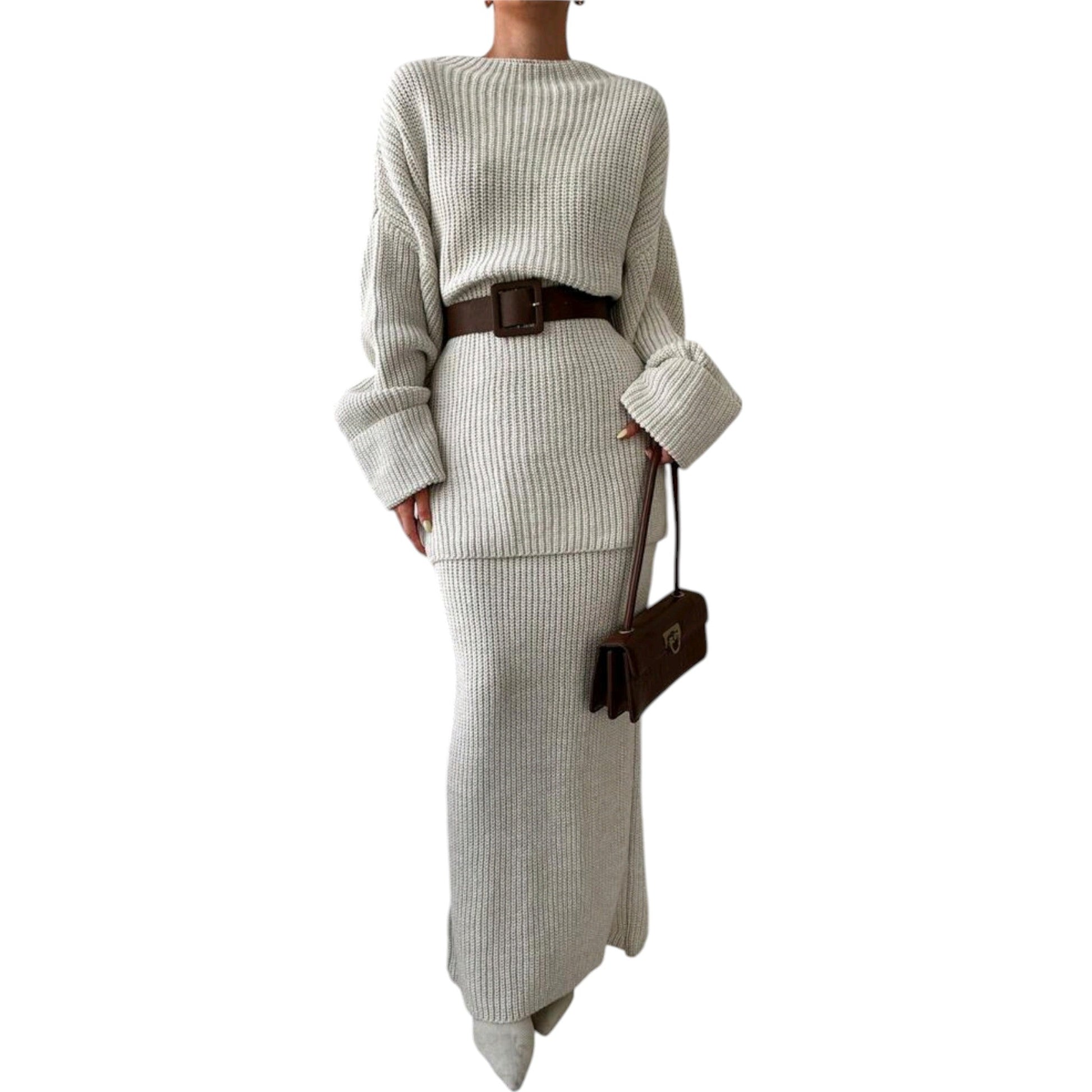 Címke nélküli, világosszürke, hosszú ujjú, kerek nyakú pulóver és maxi szoknya szett, bordázott kötésű.