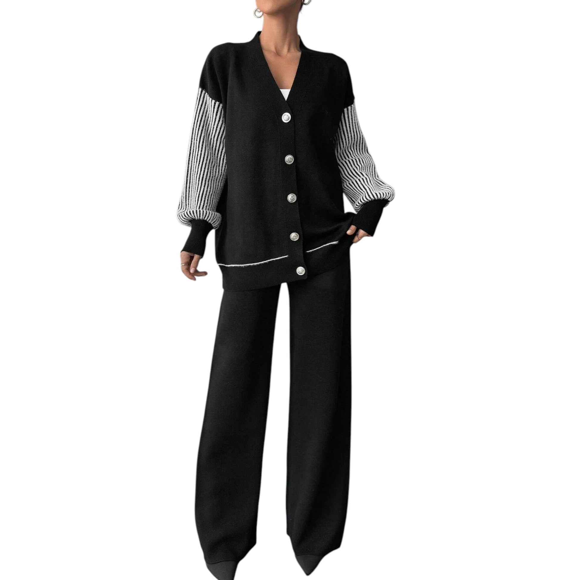 Címke nélküli, fekete, V-nyakú, gombos kardigán fehér csíkos ujjakkal és hozzáillő széles szárú kötött nadrág.