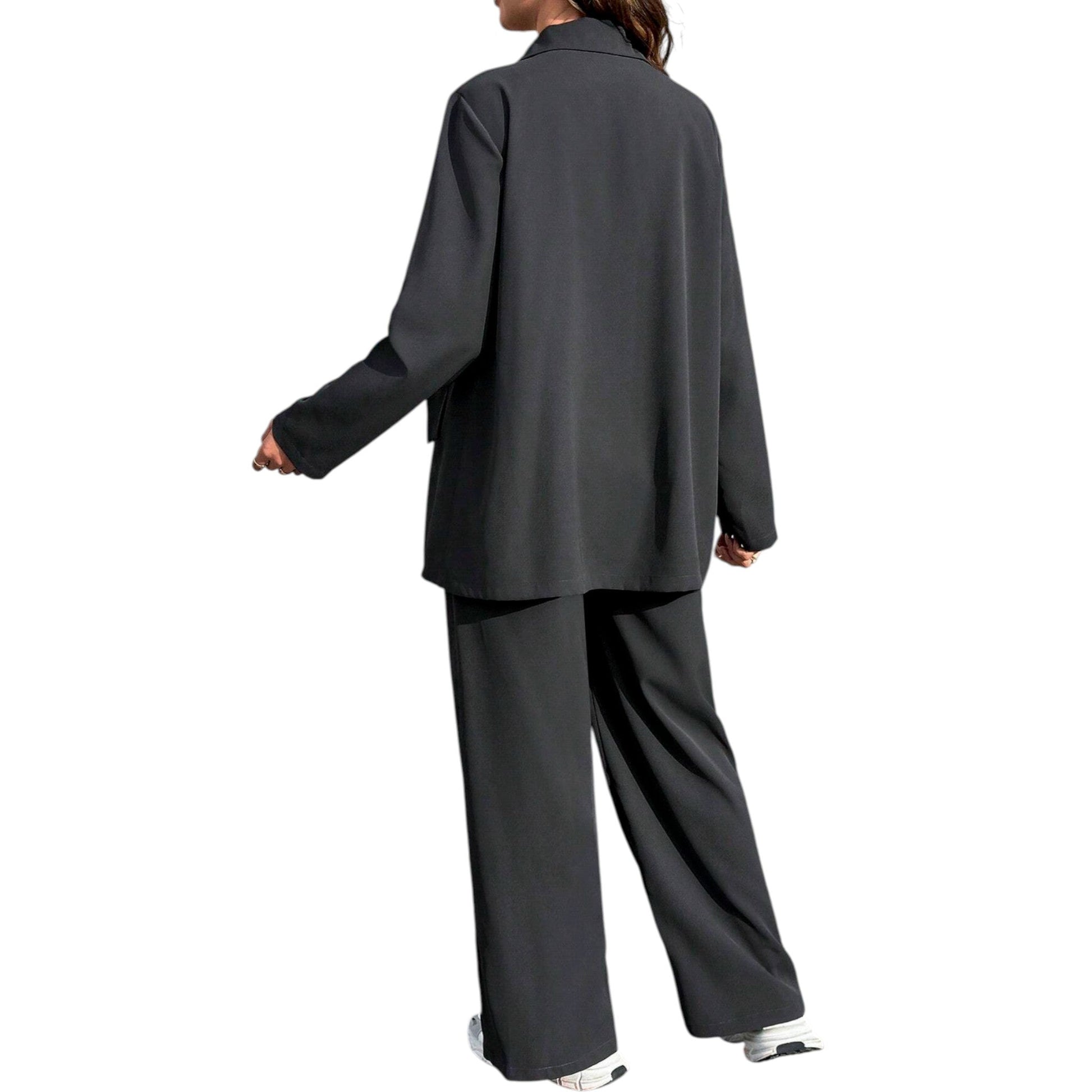 Címke nélküli, sötétszürke, duplasoros, galléros blézer és hozzáillő egyenes szárú nadrág.
