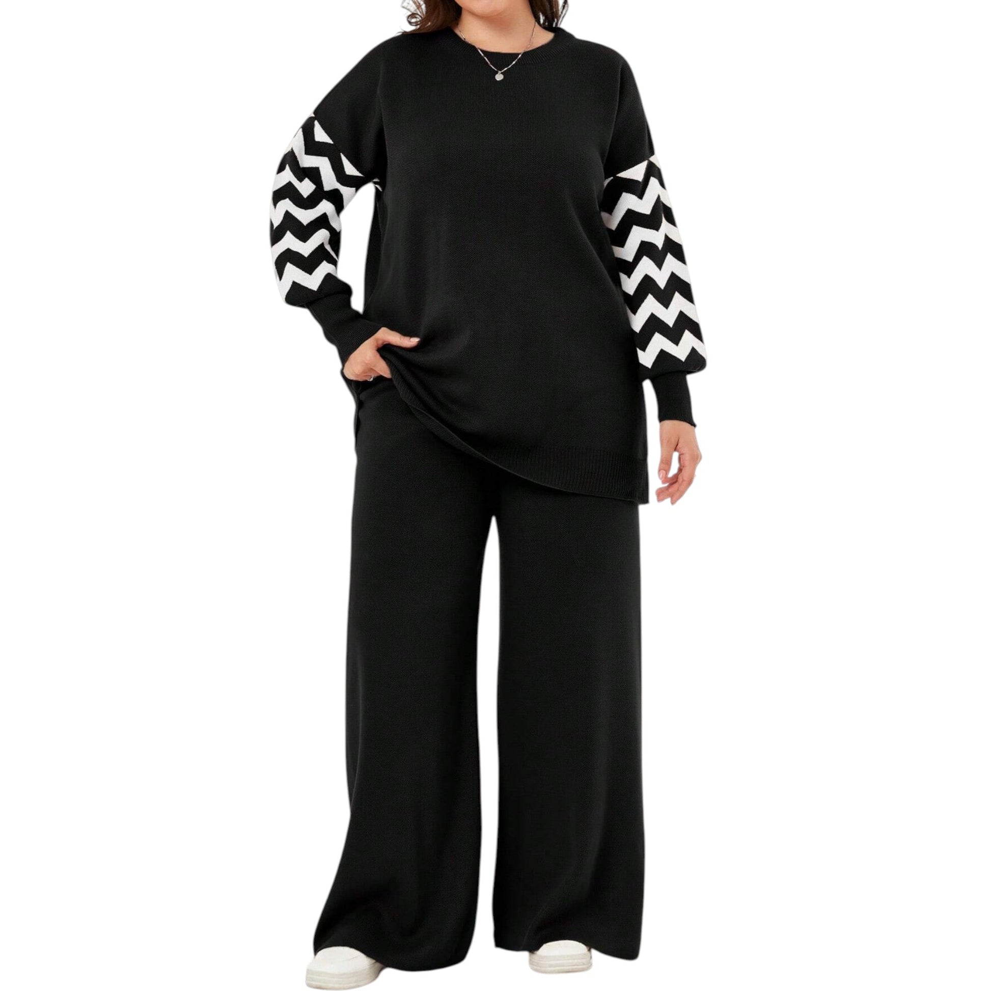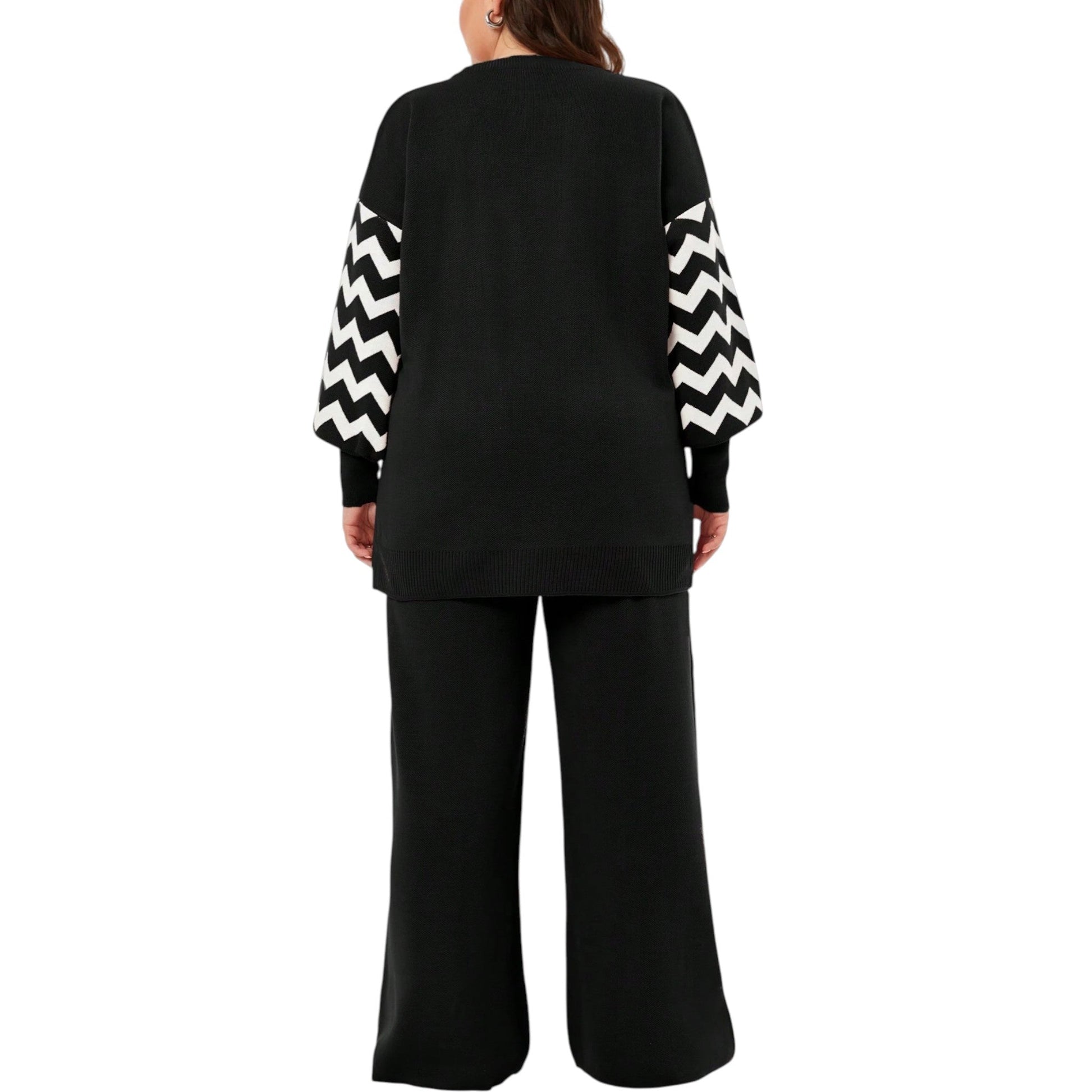 Címke nélküli, fekete, kötött, hosszú ujjú felső fehér chevron mintás puffos ujjakkal és hozzáillő széles szárú kötött nadrág.