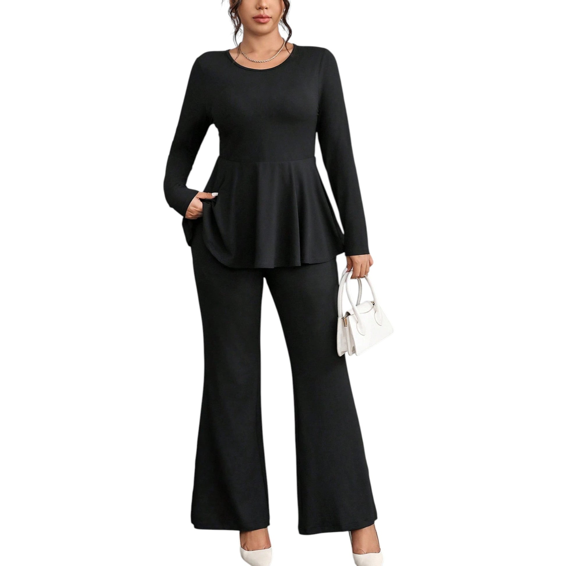 Címke nélküli, fekete, kerek nyakú, hosszú ujjú peplum felső és hozzáillő harangszárú nadrág.