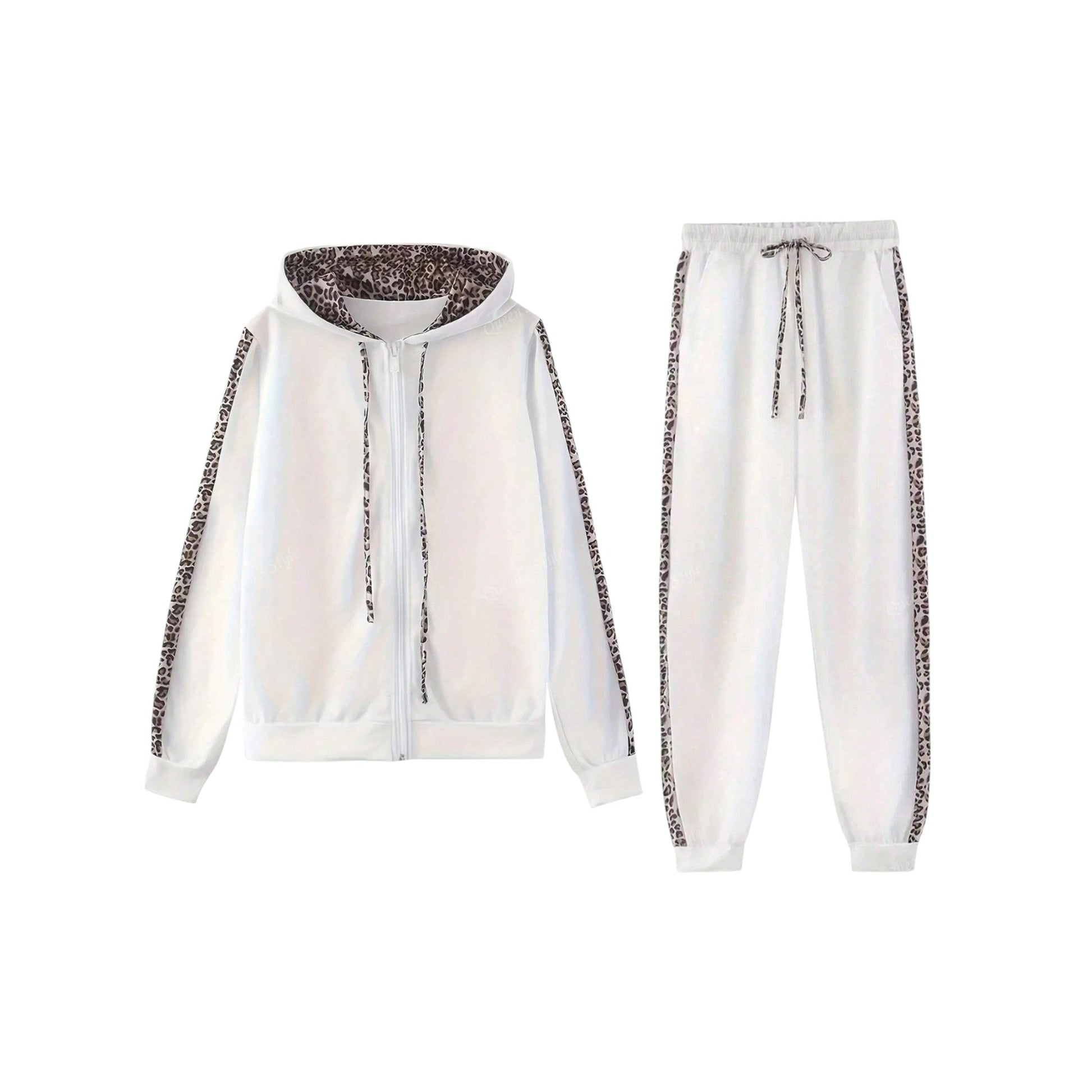 Címke nélküli, fehér, cipzáros, kapucnis pulóver és hozzáillő melegítő nadrág, mindkettőn leopárd mintás betétekkel.