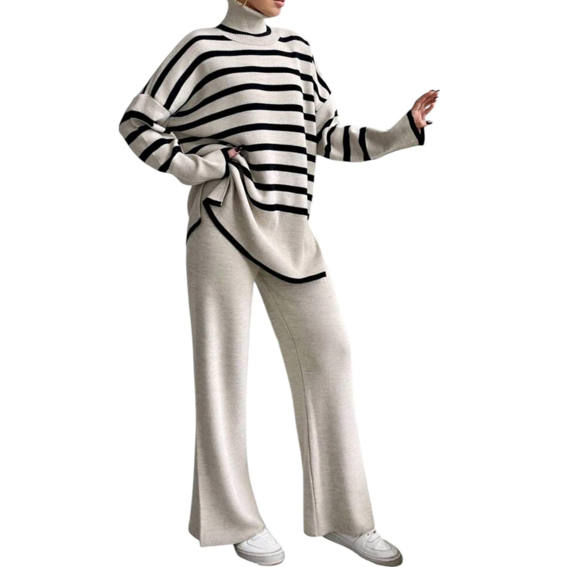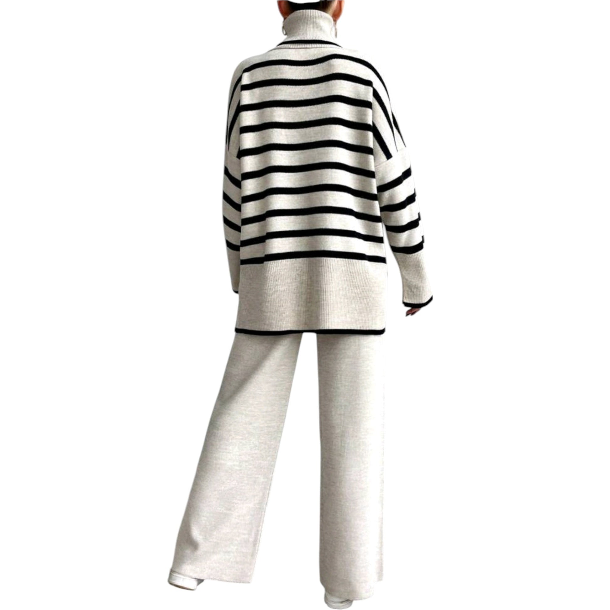 Címke nélküli, törtfehér, fekete csíkos, garbós, hosszú ujjú pulóver és bő szárú nadrág szett, oldalán hasított felsőrésszel.