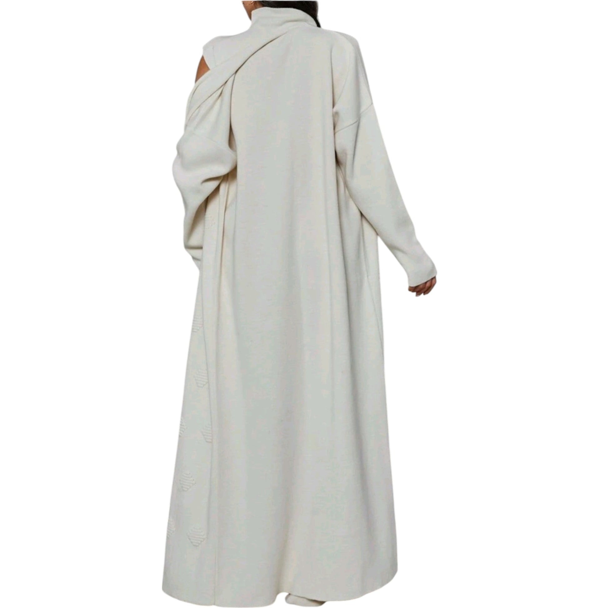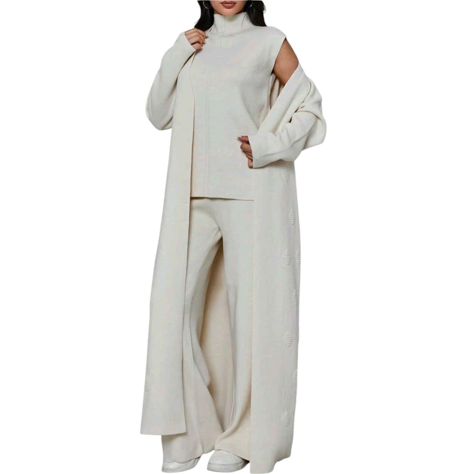 Címke nélküli, törtfehér, hosszú, ujjas, ujjatlan felső és nadrág szett, állógalléros.