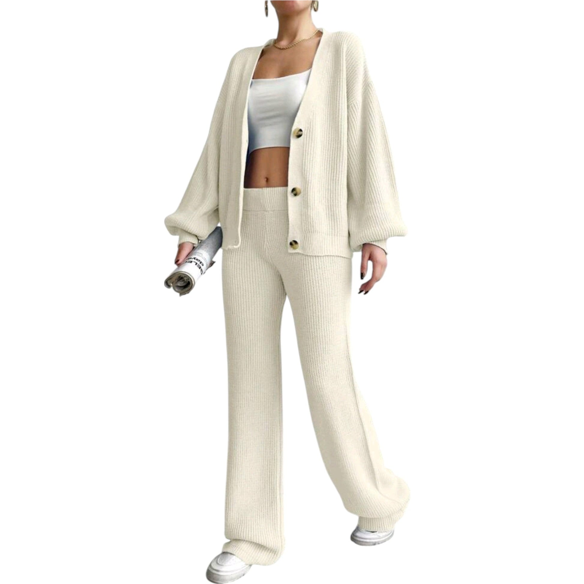 Címke nélküli, krémszínű, hosszú ujjú, gombos kardigán, top és nadrág szett, bordázott nadrággal.