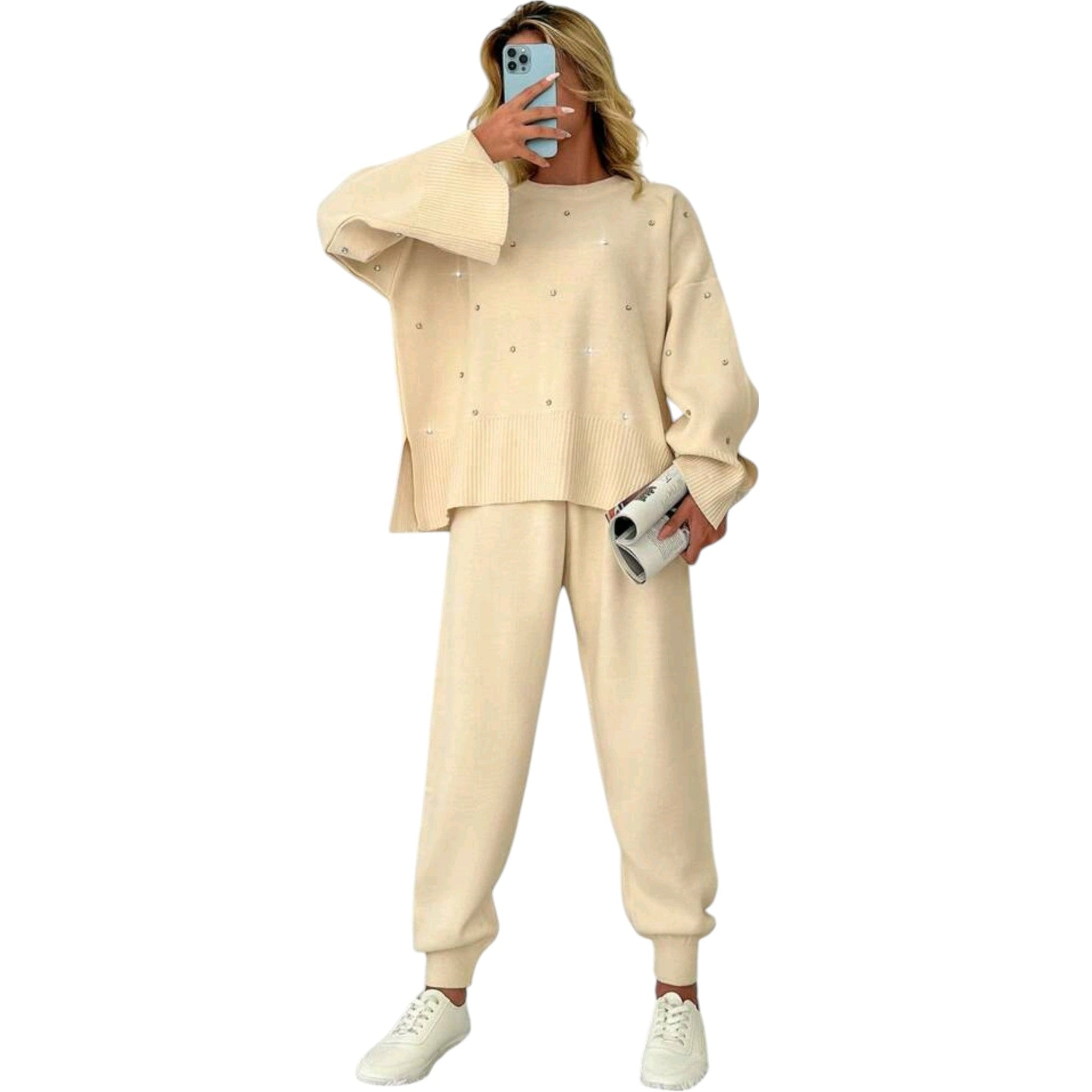 Címke nélküli, bézs, kerek nyakú, hosszú ujjú pulóver és gumis derekú nadrág szett, apró gyöngyökkel díszítve.