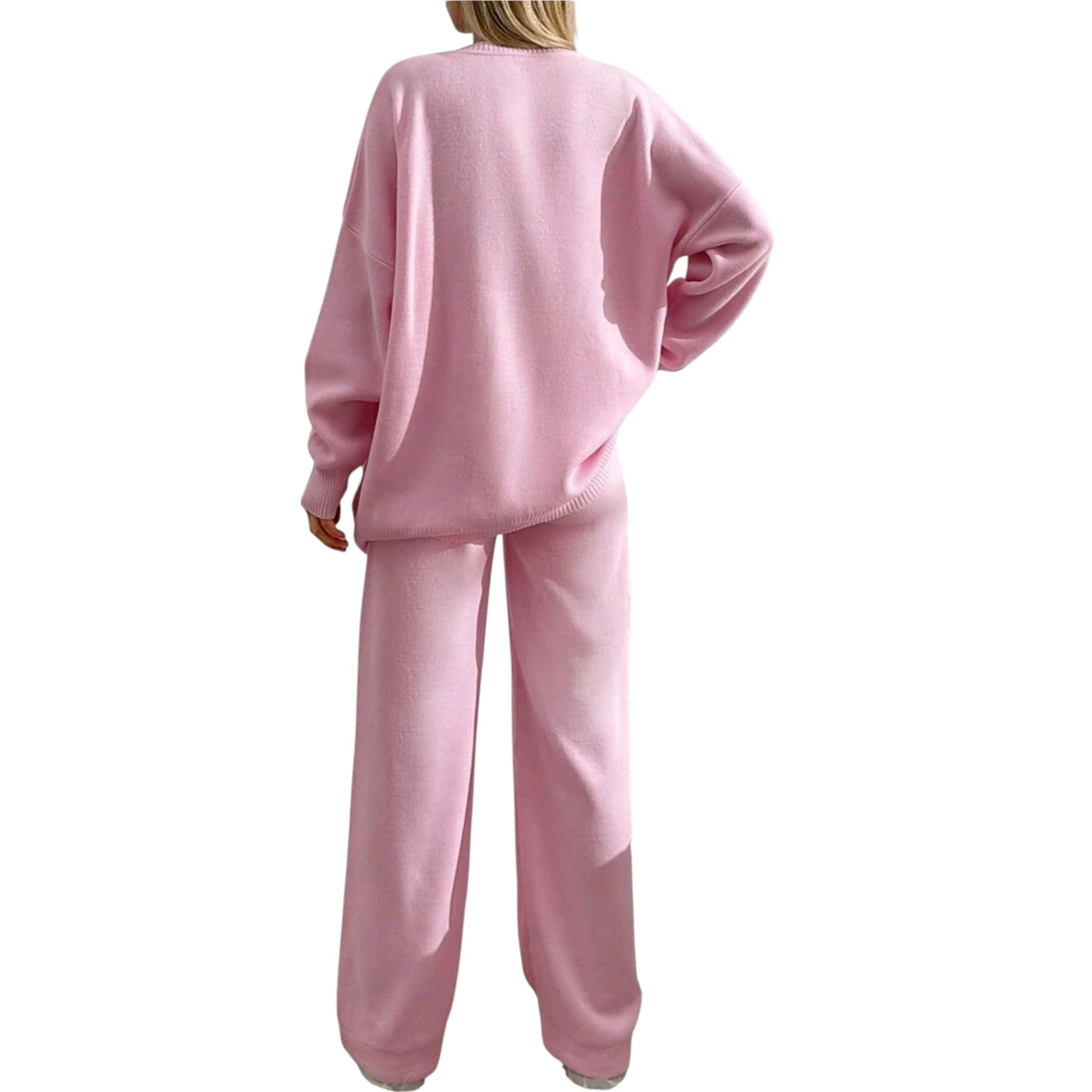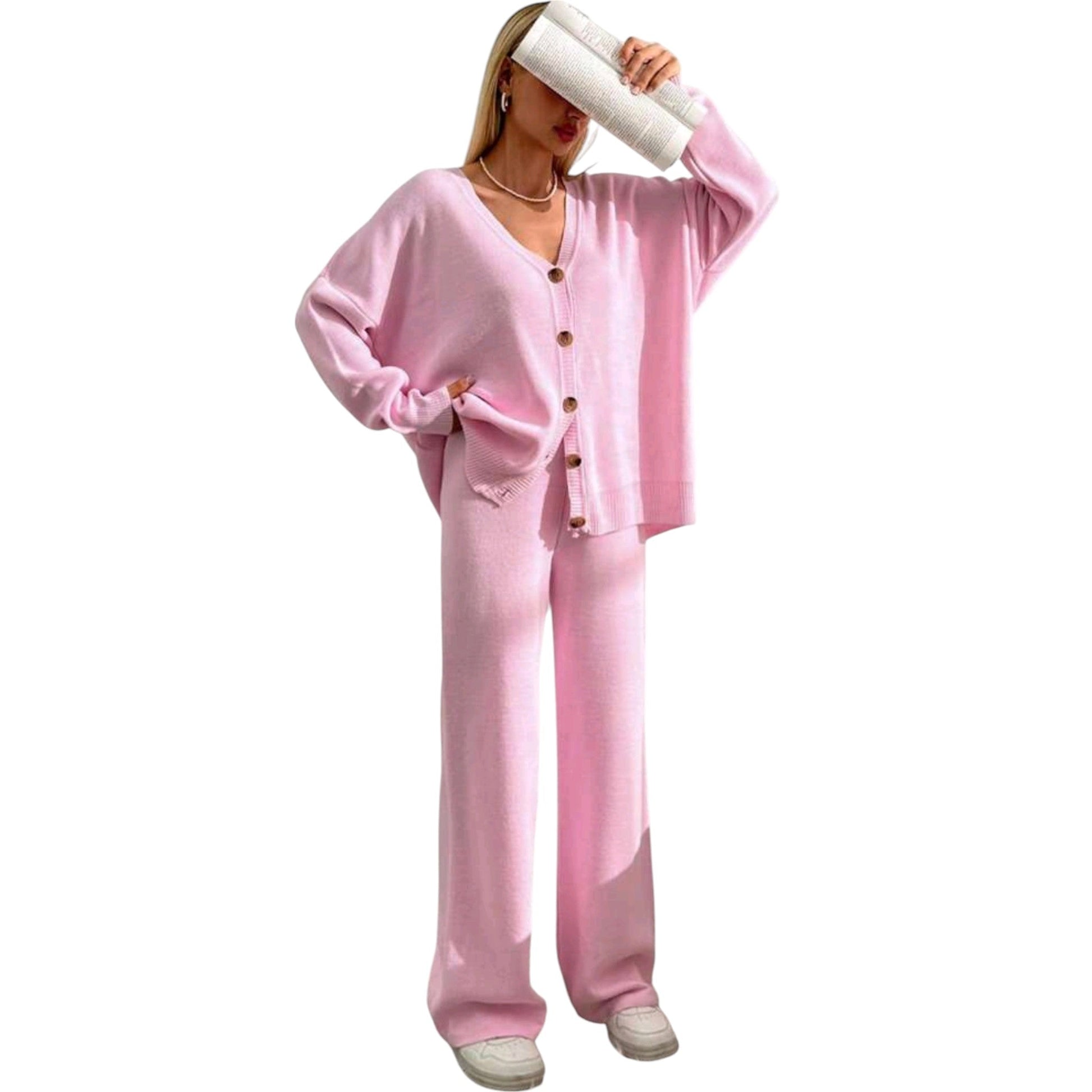 Címke nélküli, rózsaszín, V-nyakú, gombos kardigán és bő szárú nadrág szett.