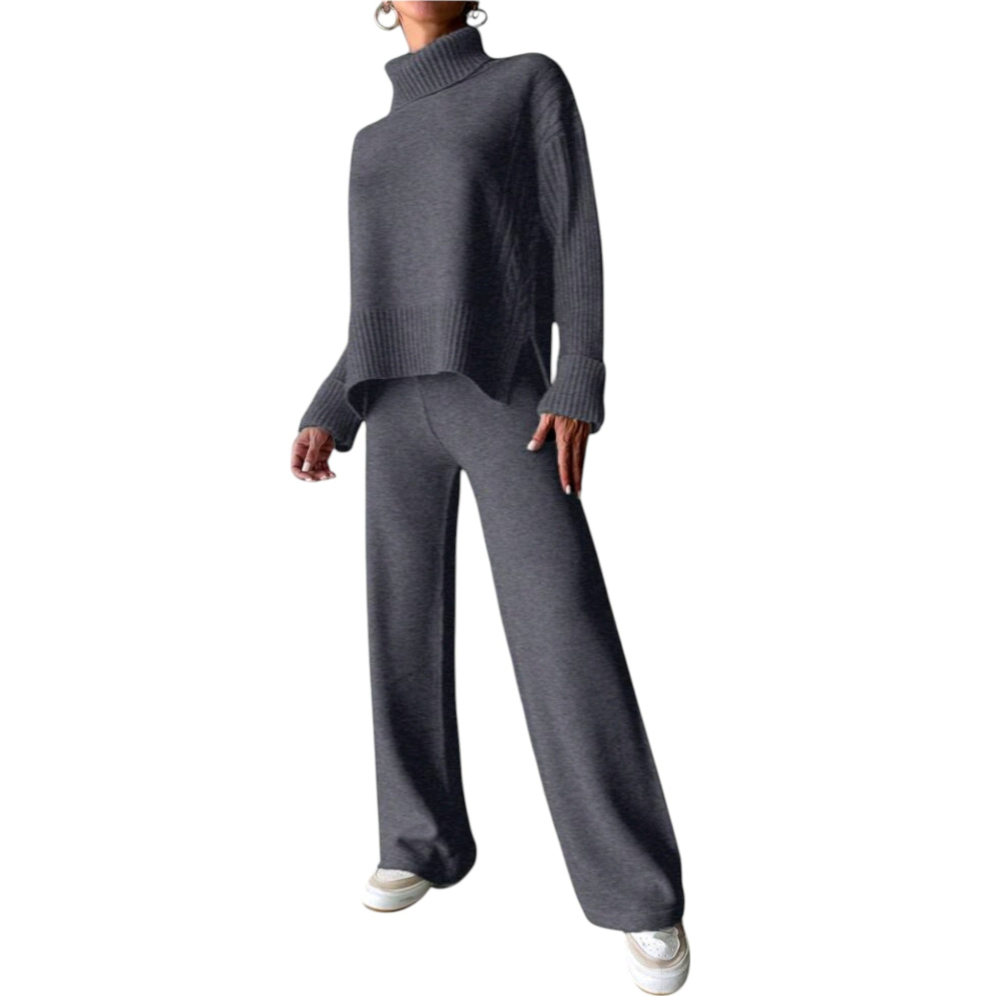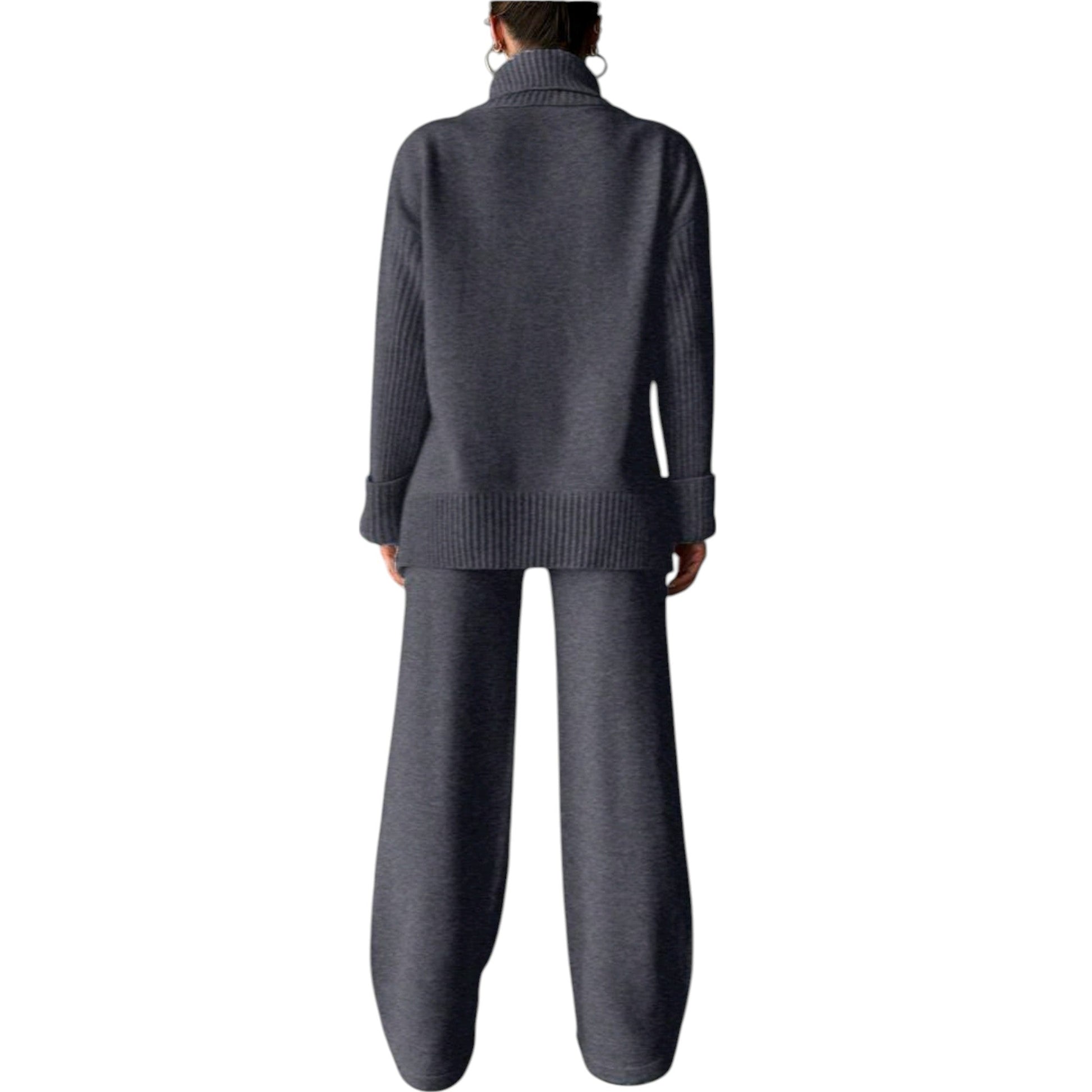 Címke nélküli, sötétszürke, garbós, hosszú ujjú pulóver és egyenes szárú nadrág szett.