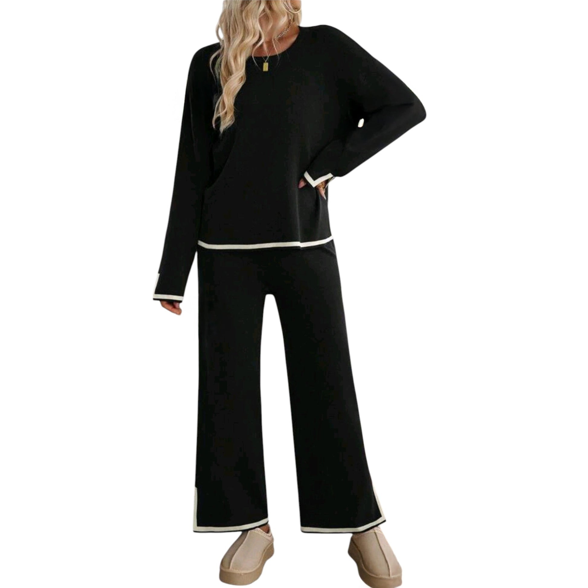 Címke nélküli, fekete, hosszú ujjú felső és nadrág szett, fehér szegéllyel, oldalt hasított nadrágszárral.
