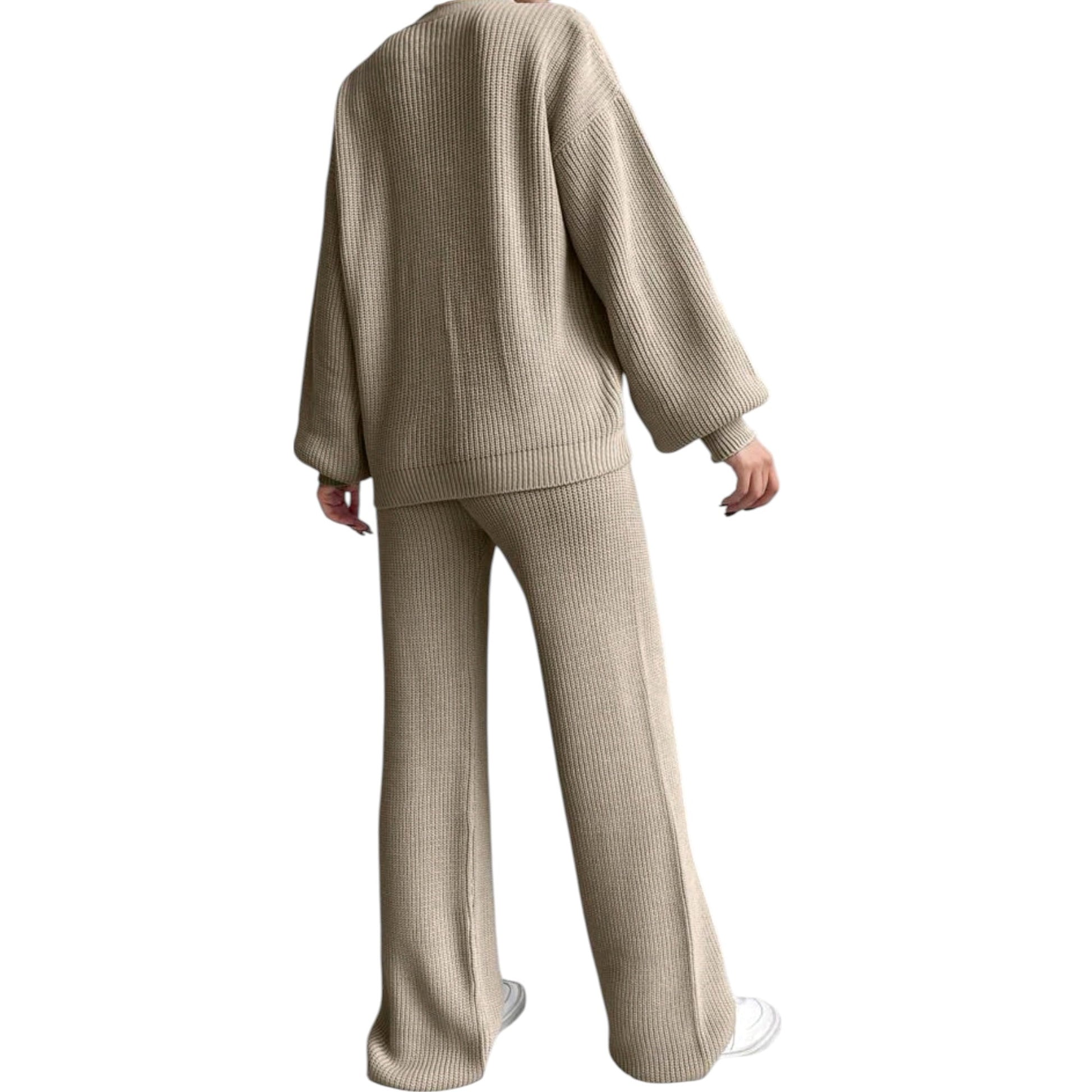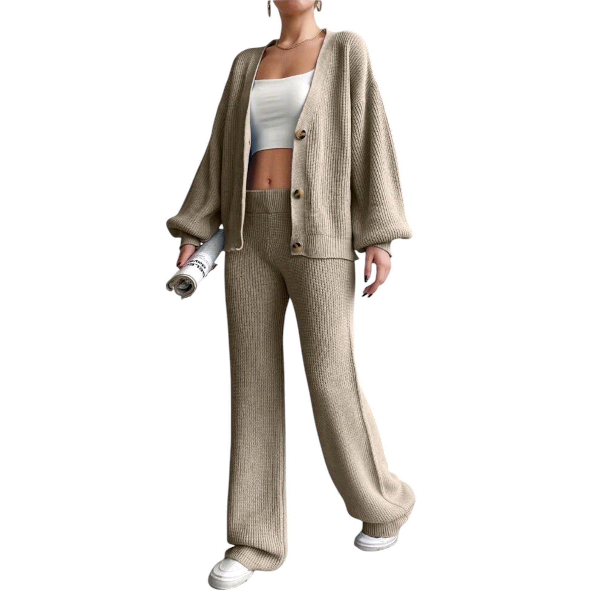 Címke nélküli, bézs, hosszú ujjú, gombos kardigán, top és bő szárú nadrág szett, bordázott nadrággal.