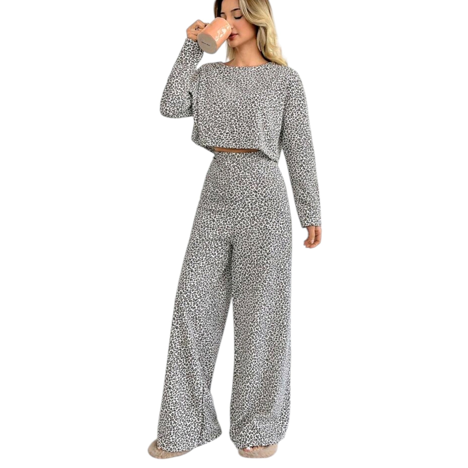Címke nélküli, szürke, hosszú ujjú, kerek nyakú, rövid felső és magas derekú, leopárdmintás hosszú nadrág szett.