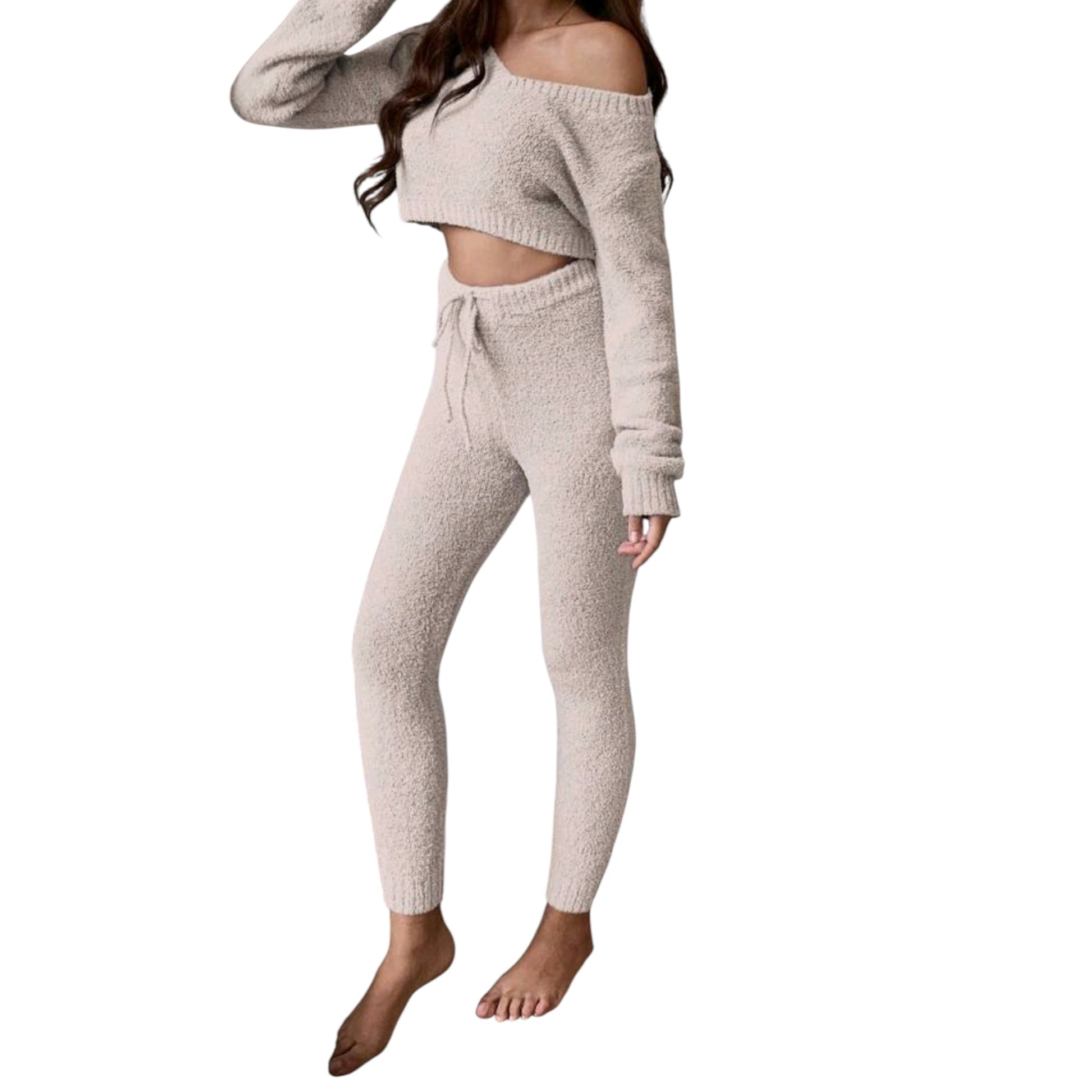 Címke nélküli, bézs, hosszú ujjú, plüss anyagú, váll nélküli, rövid felső és hozzáillő, hosszú, plüss anyagú nadrág szett, nadrág dereka húzózsinórral állítható.