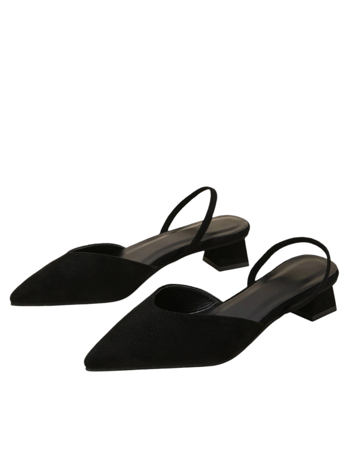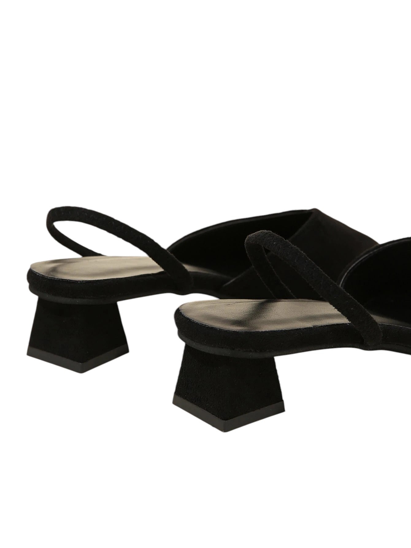 Címke nélküli, fekete velúr, hegyes orrú, slingback fazonú, vastag alacsony sarkú magassarkú cipő