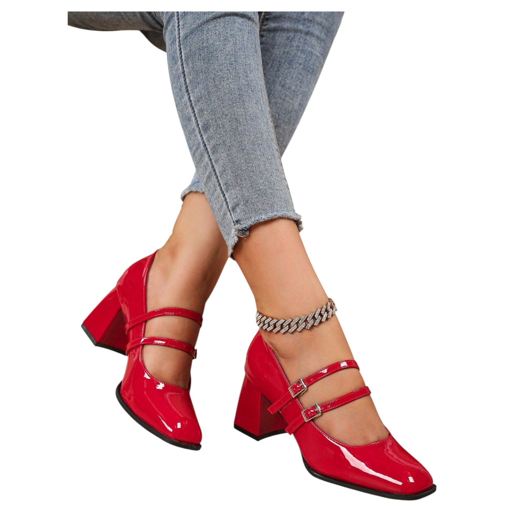 Címke nélküli, piros, magas sarkú Mary Jane cipő, vastag blokksarokkal és egy vékony bokapánttal. Belső talp hossz: 25cm