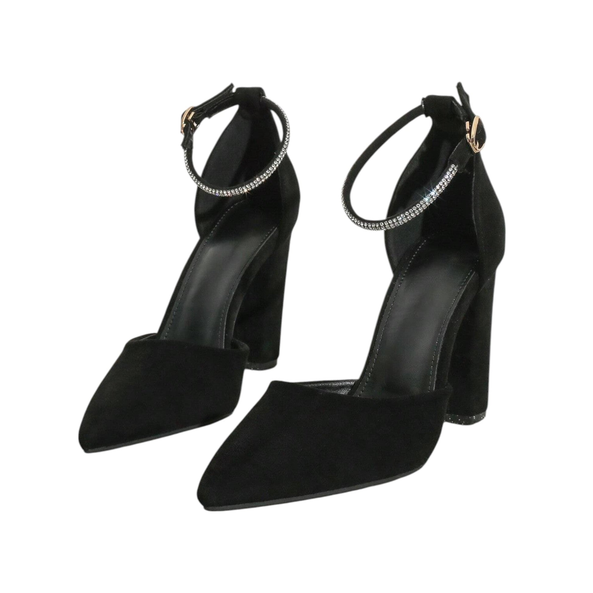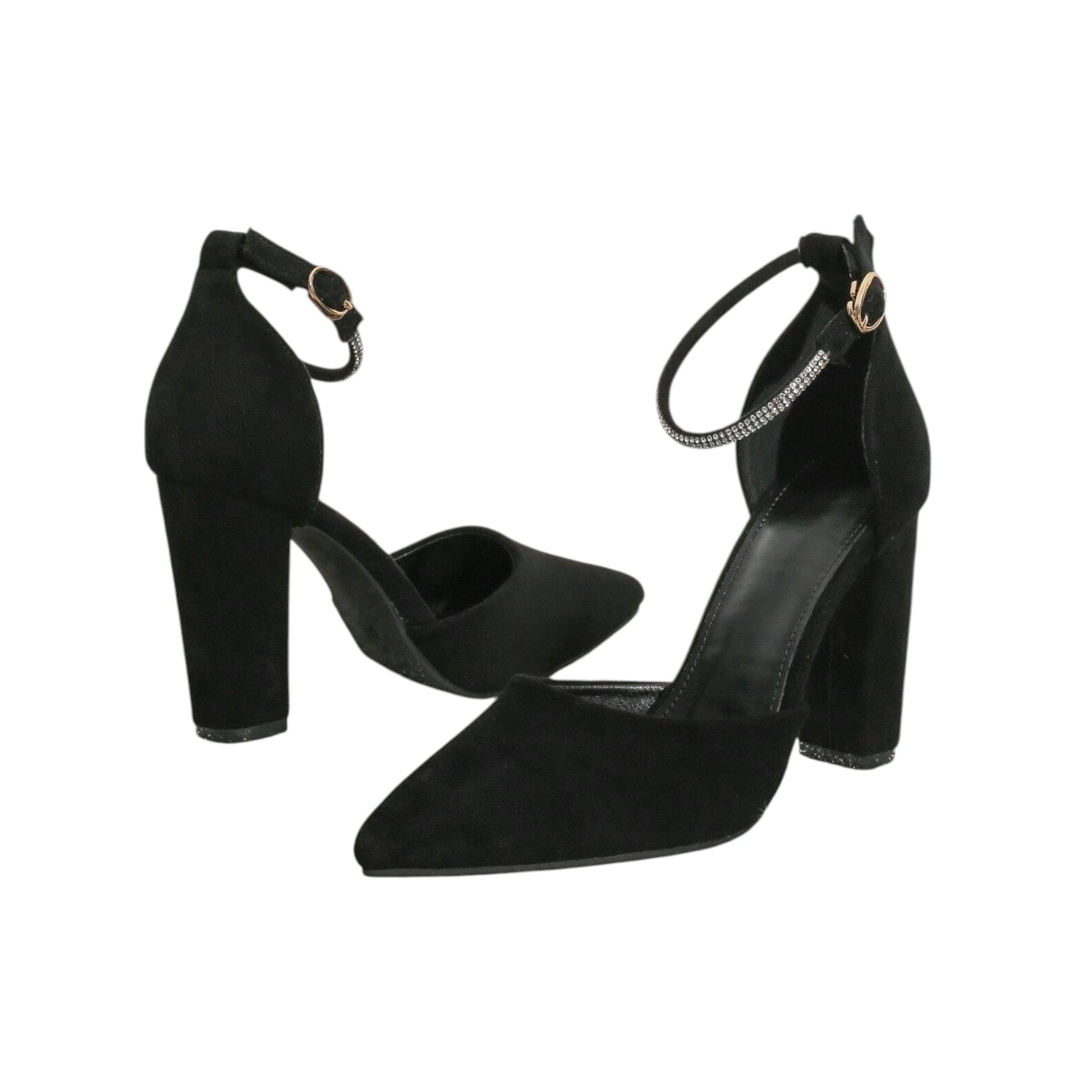 Címke nélküli, fekete, velúr, hegyes orrú, bokapántos, vastag sarkú magassarkú. Belső talp hossz: 25,5cm