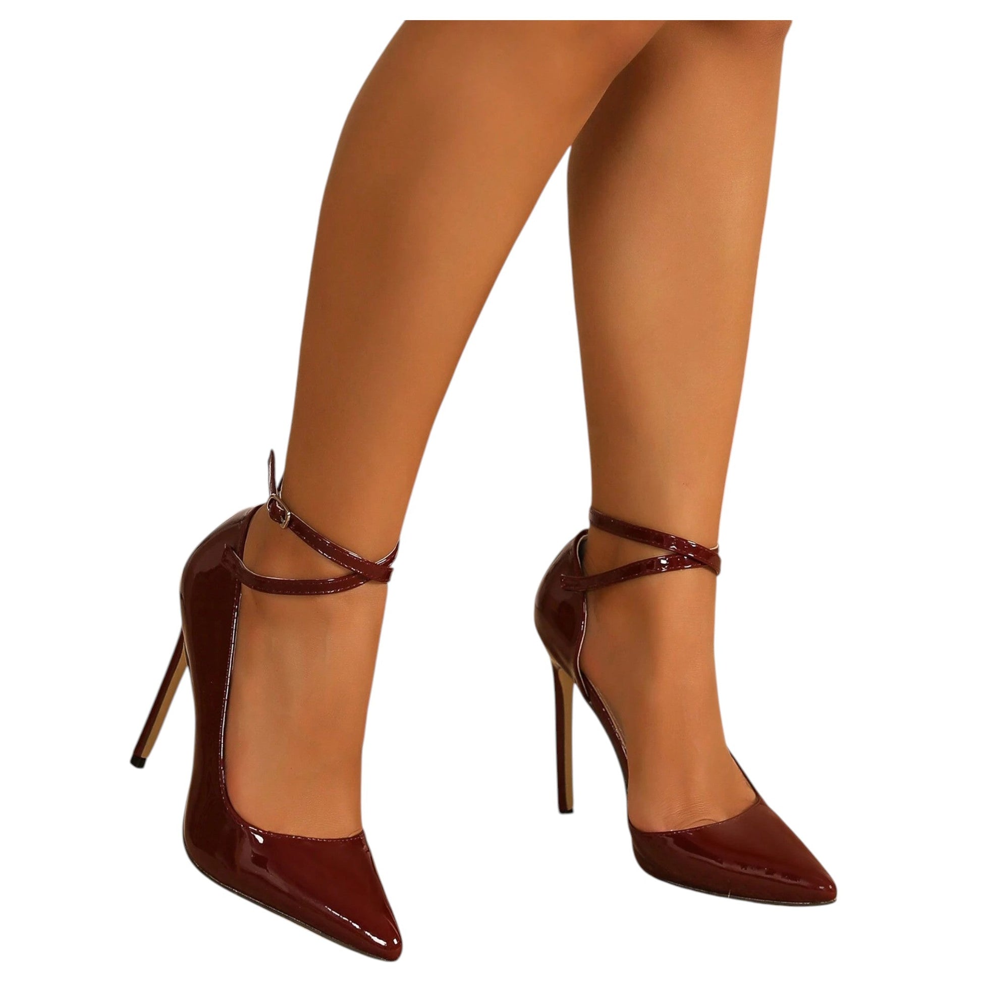 Címke nélküli, bordó, lakk, hegyes orrú, tűsarkú cipő bokapánttal. Belső talp hossz: 23cm