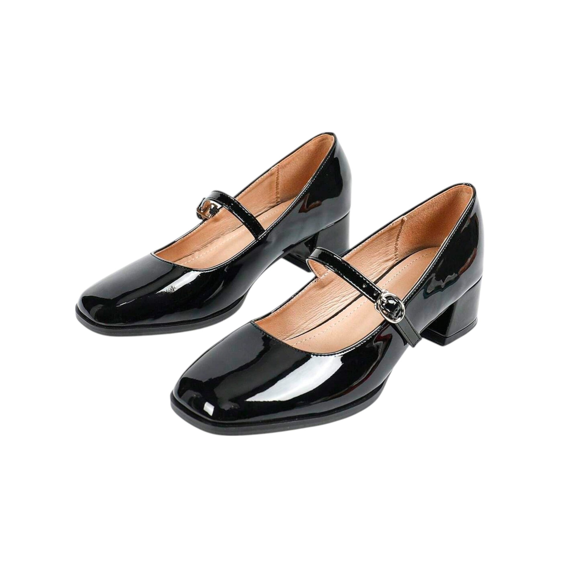 Címke nélküli, fekete színű, pántos cipő, blokk sarokkal, lakkozott hatással. Belső talp hossz: 22,3cm
