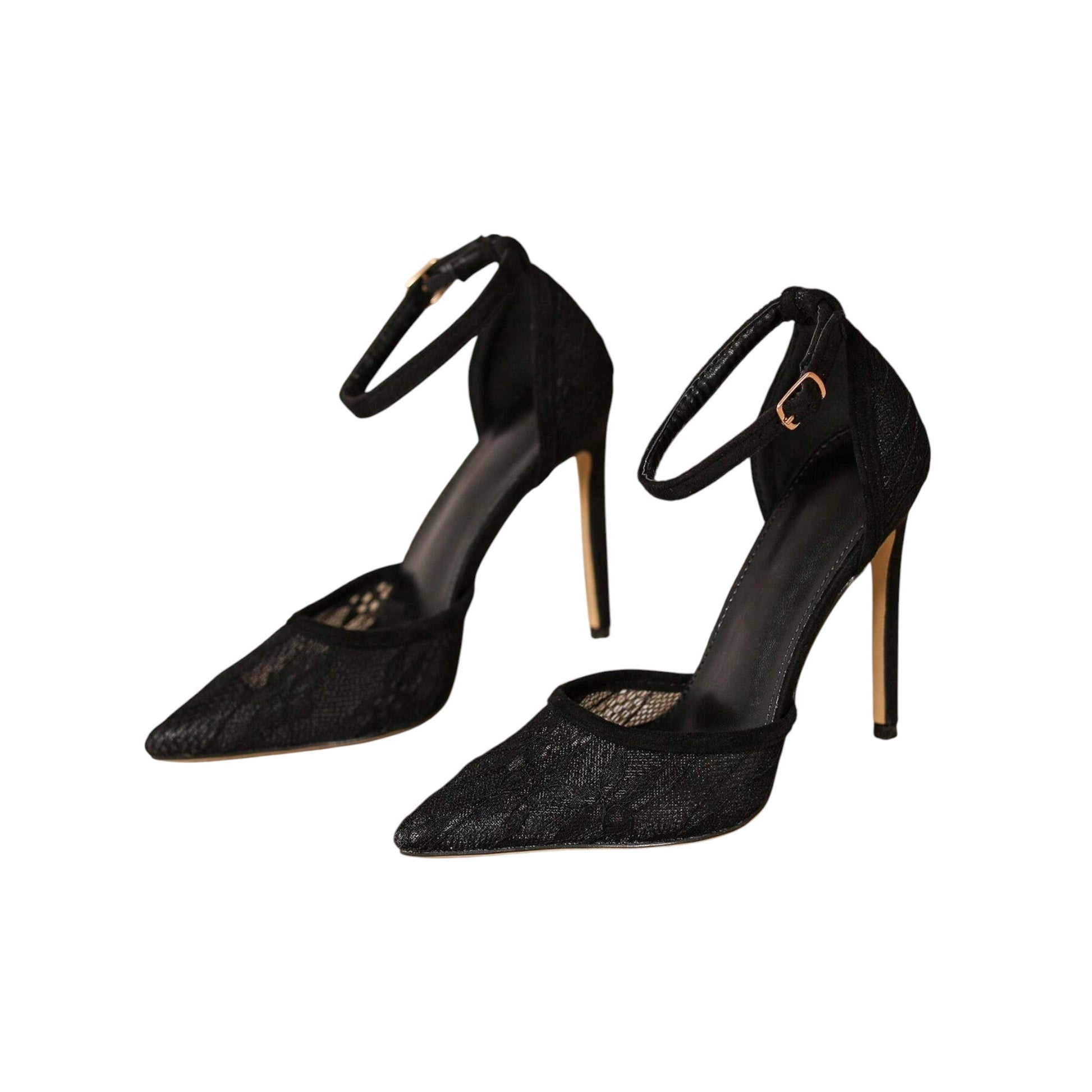 Címke nélküli, fekete színű, csipkés cipő, hegyes orrú, vágott oldallal és tűsarokkal.
