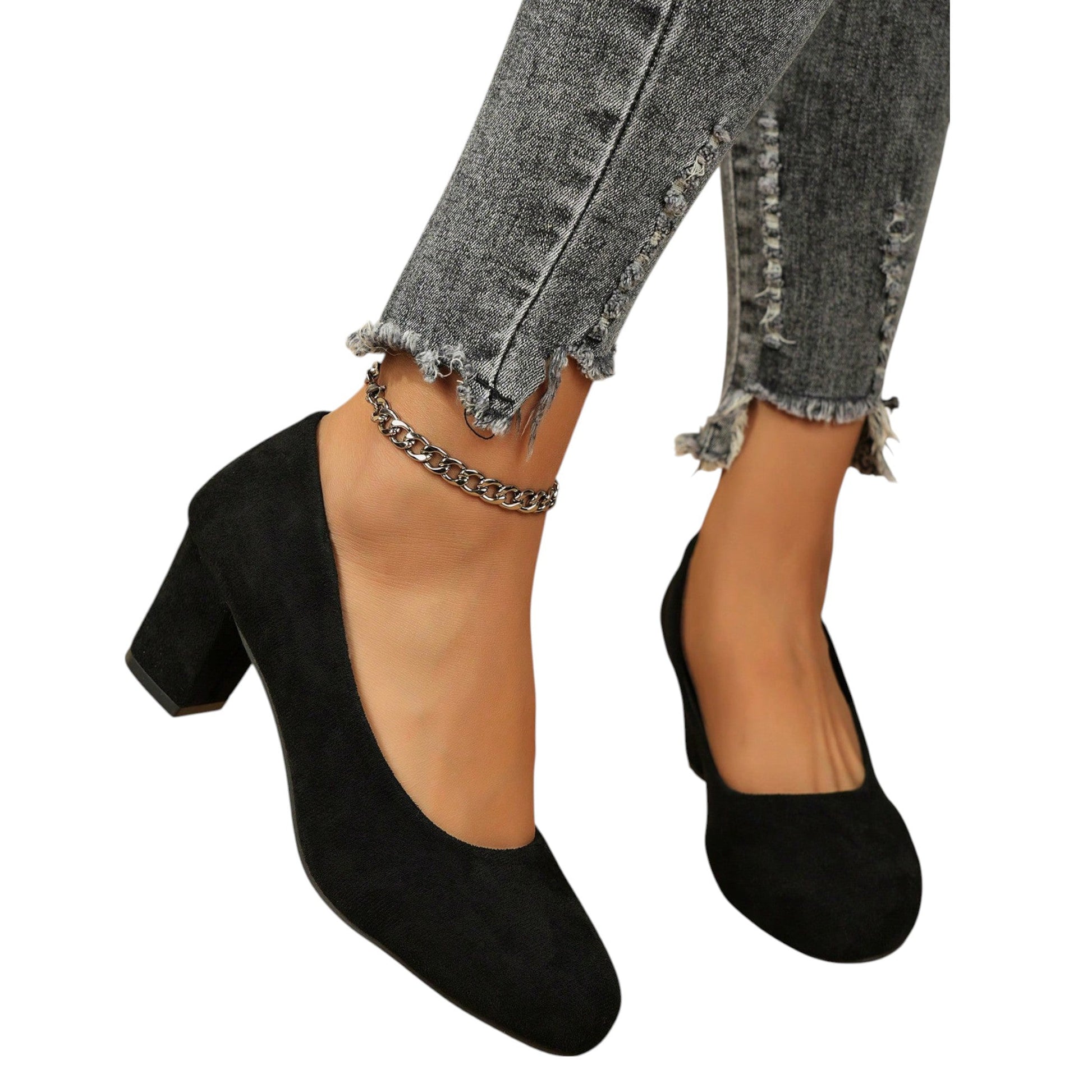 Címke nélküli, fekete, velúr hatású anyag, kerek orr, tömb sarok.