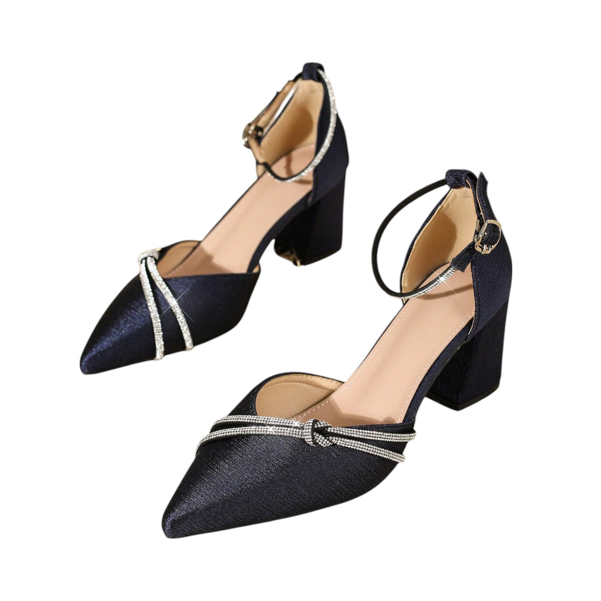 Címke nélküli, sötétkék színű, magas blokksarkú, hegyes orrú, strasszos csomózott díszítéssel, bokapánttal és csattal.