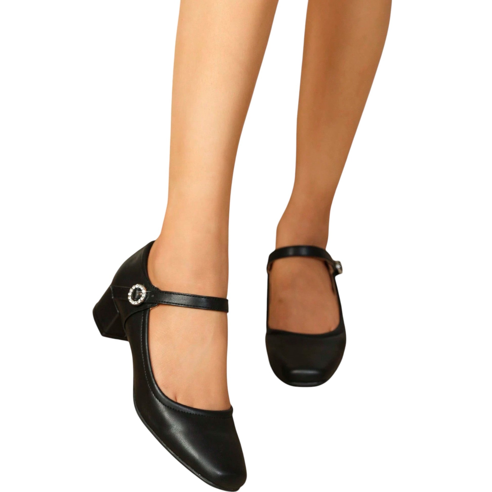 Címke nélküli, fekete színű, blokksarkú, kerek orrú, bokapánttal és strasszos csattal.