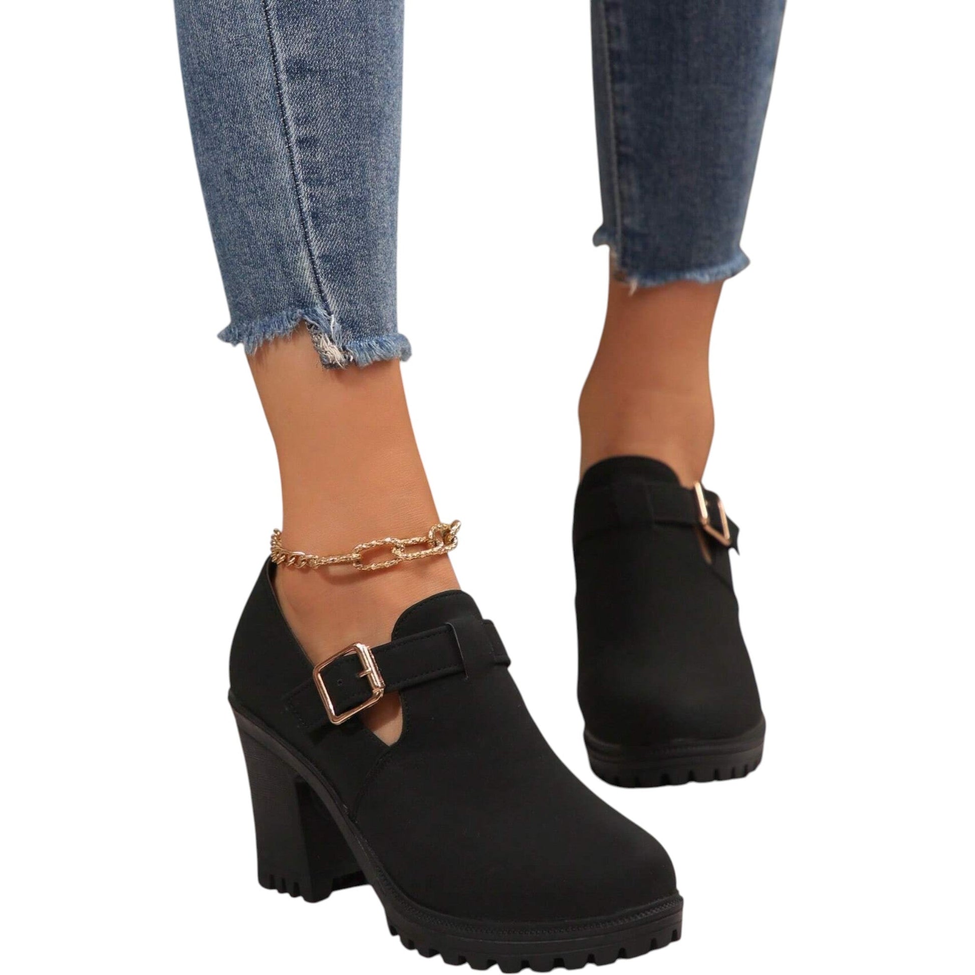 SHE fekete tömbsarkú csatos cipő