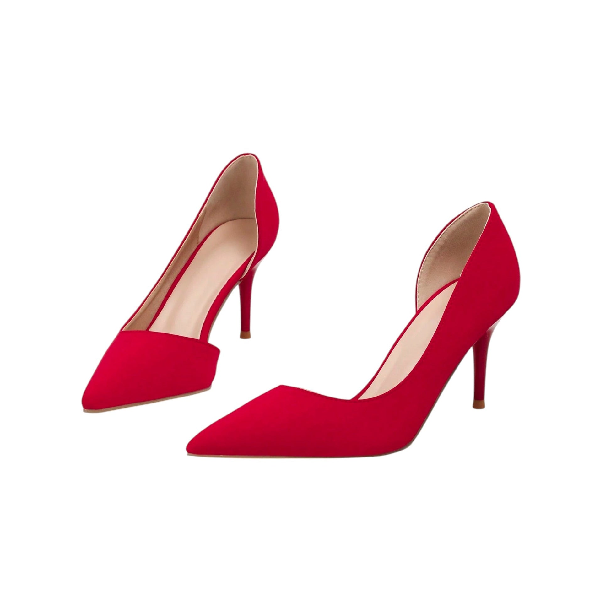 Címke nélküli, piros, velúr hatású, hegyes orrú, magas sarkú, d'Orsay szabású magassarkú cipő.