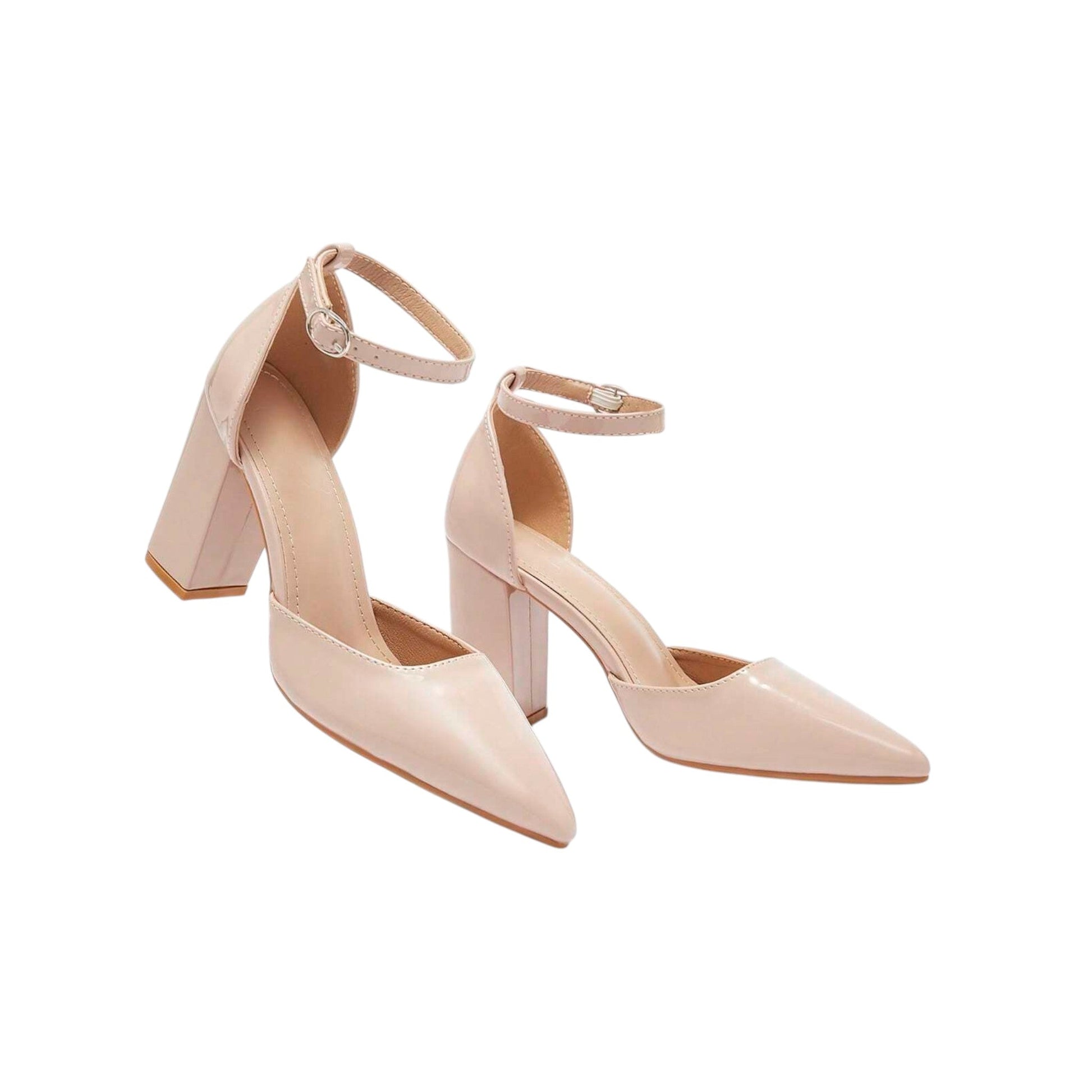 Címke nélküli, púder színű, hegyes orrú, vastag tömbsarkú magassarkú cipő, bokapánttal.