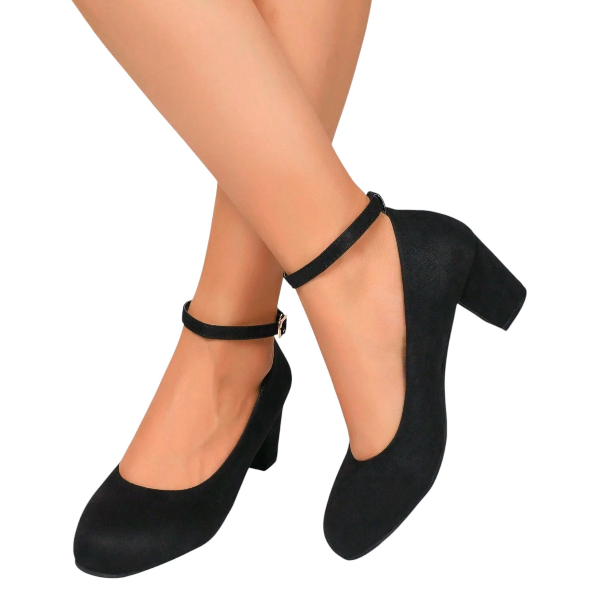 Címke nélküli, fekete, velúr hatású, kerek orrú, vastag sarkú, bokapántos, csatos. Belső talp hossz: 22,5cm