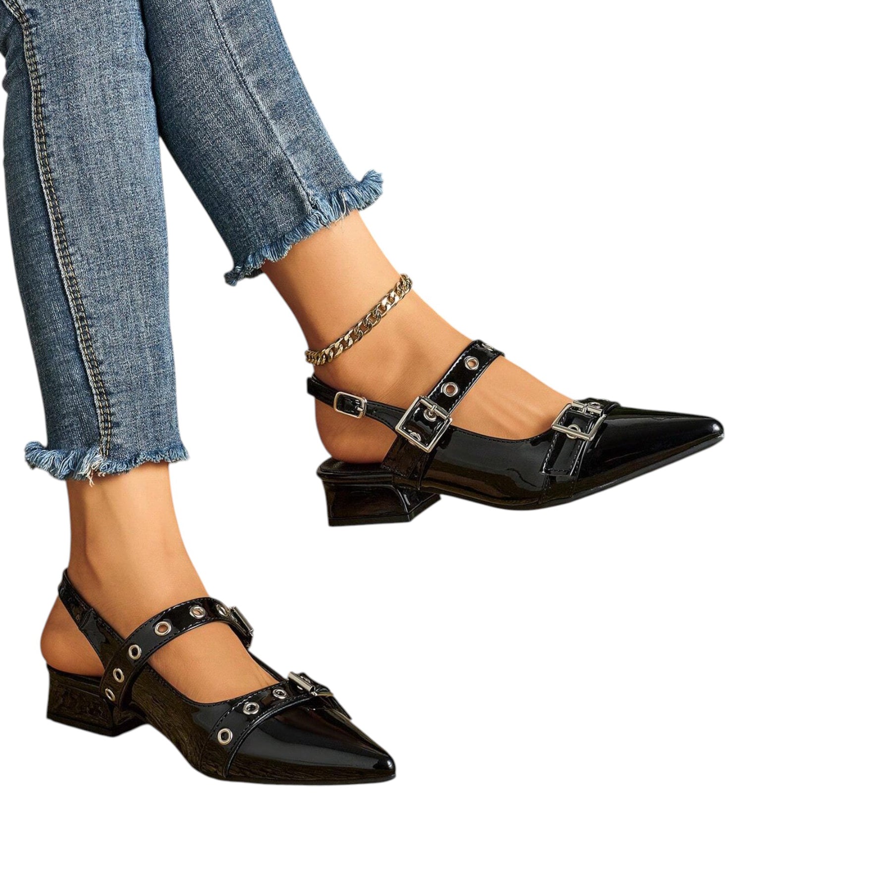 Címke nélküli, fekete, lakkozott, hegyes orrú, több csattal és fém karikával díszített, bokapántos, csatos, alacsony sarkú. Belső talp hossz: 22cm