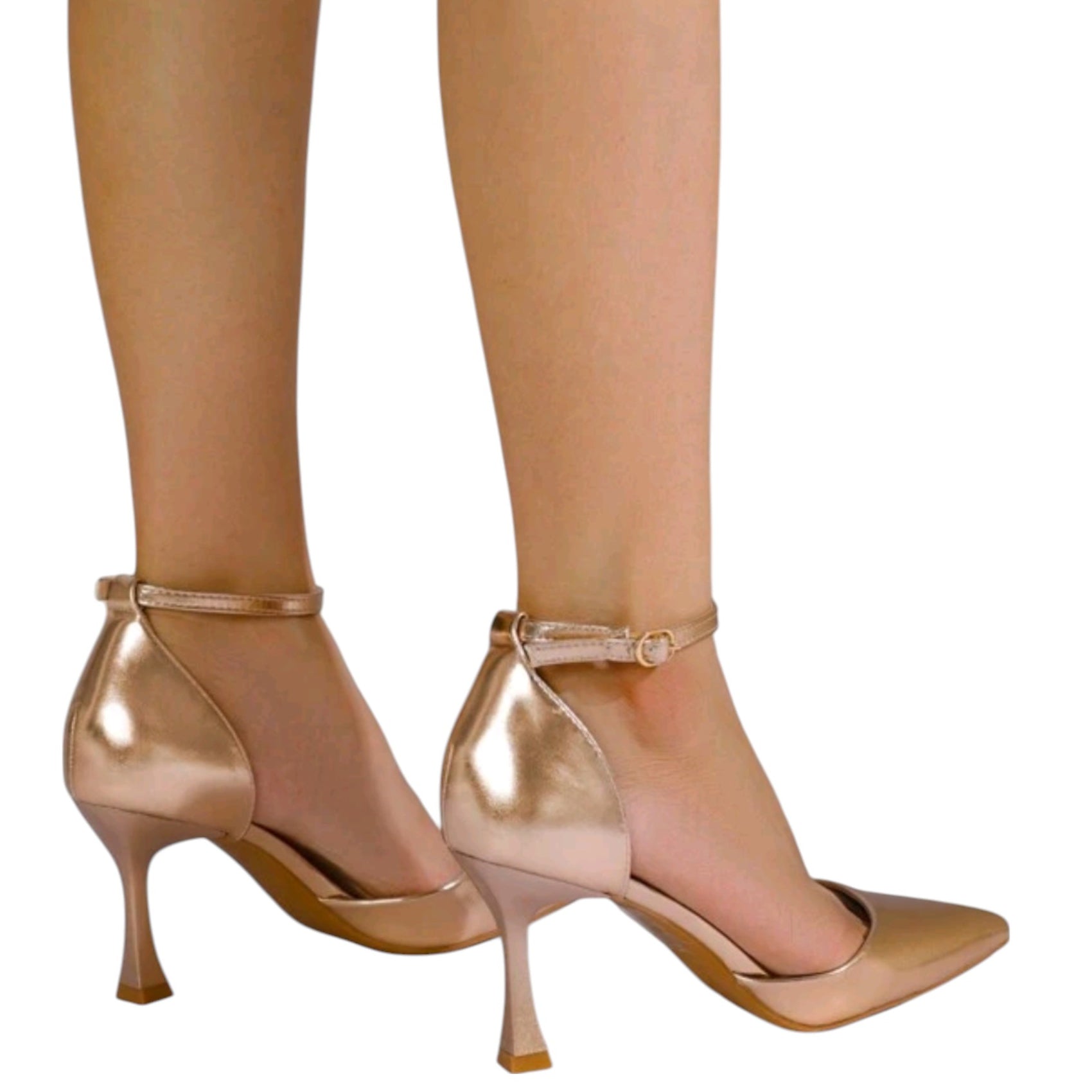 Címke nélküli, rosegold, hegyes orrú, bokapántos, vékony sarkú magassarkú cipő. Belső talp hossz: 23cm