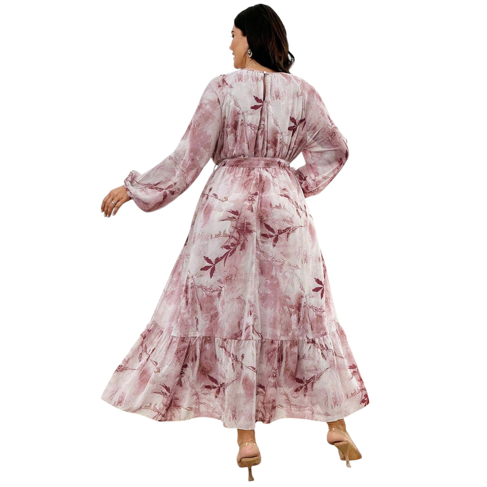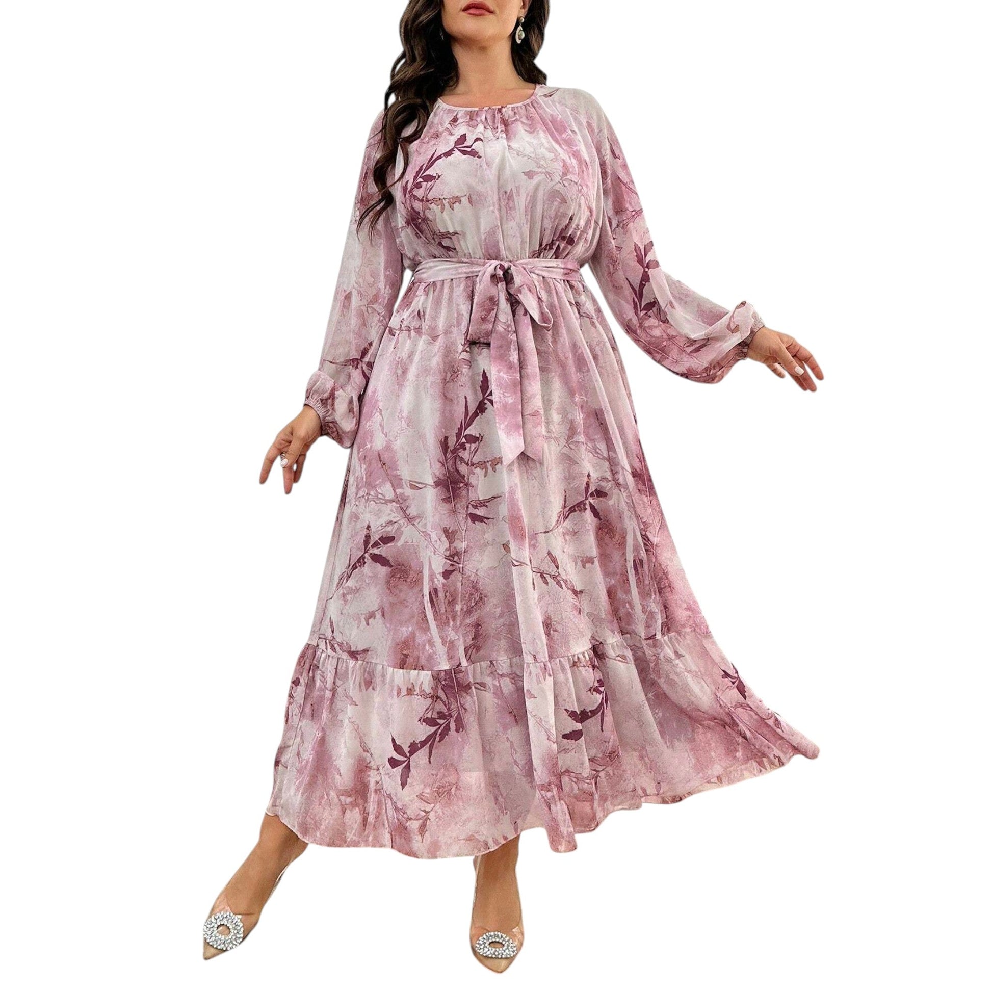 Címke nélküli, rózsaszín, virágmintás sifon maxi ruha hosszú ujjakkal és övvel.