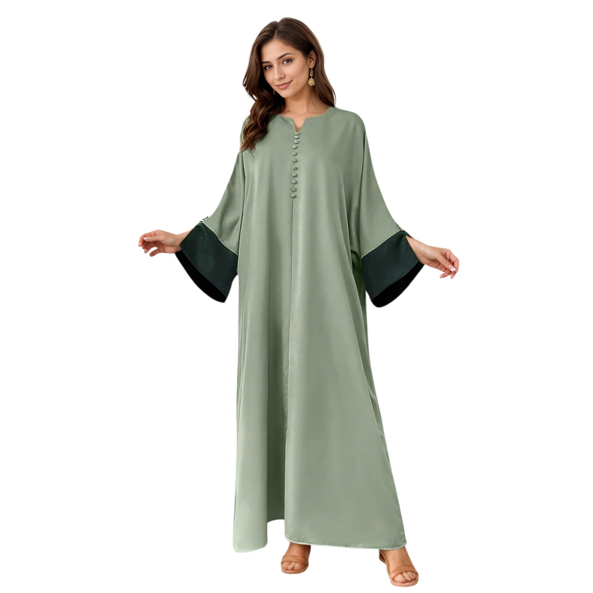 Címke nélküli, zöld, hosszú ujjú, gombos, egyszerű kaftán, sötétzöld mandzsettával.
