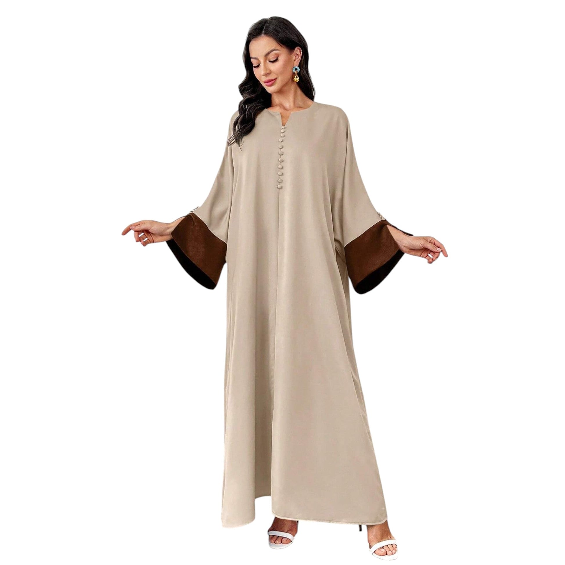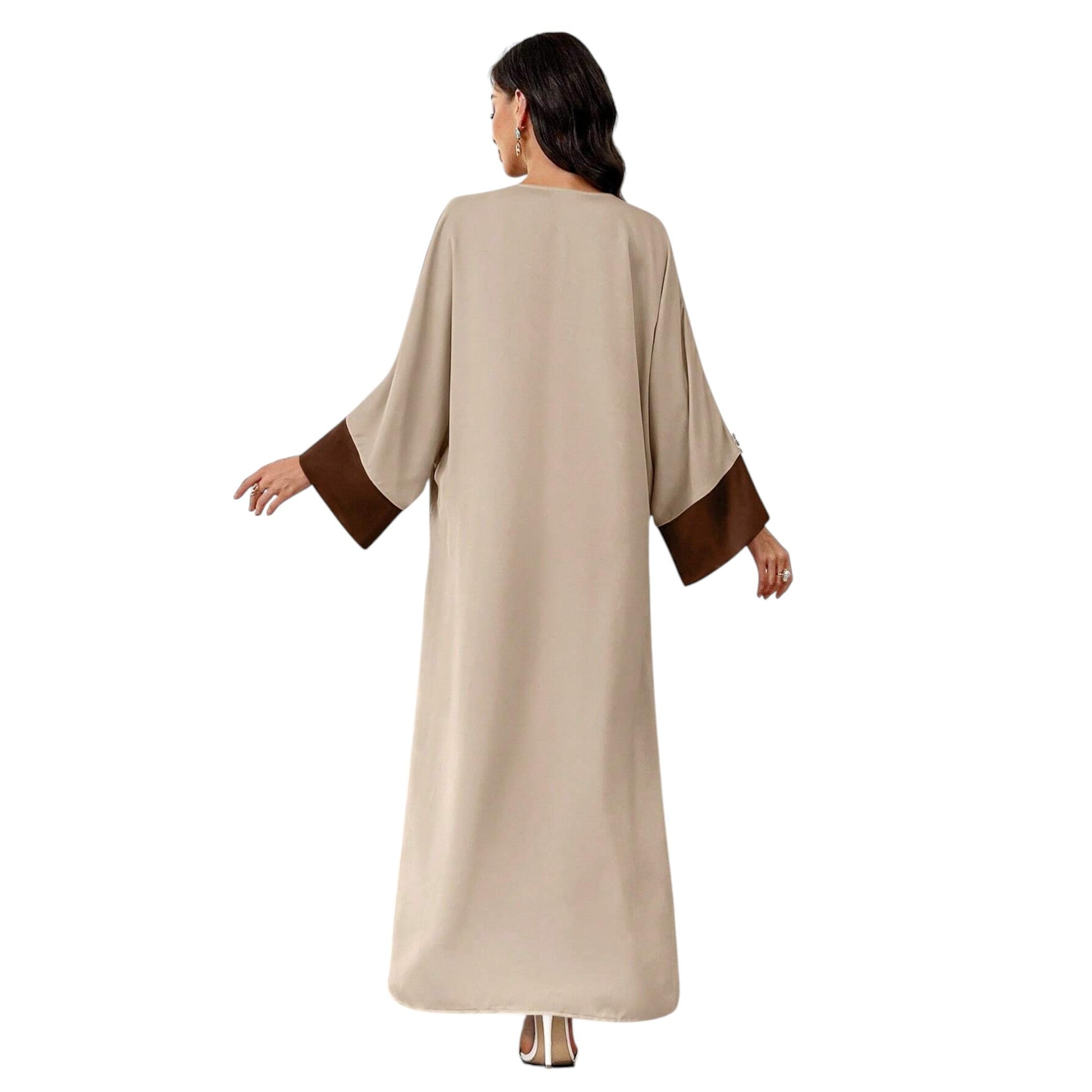 Címke nélküli, bézs, hosszú ujjú, gombos kaftán, barna mandzsettával.
