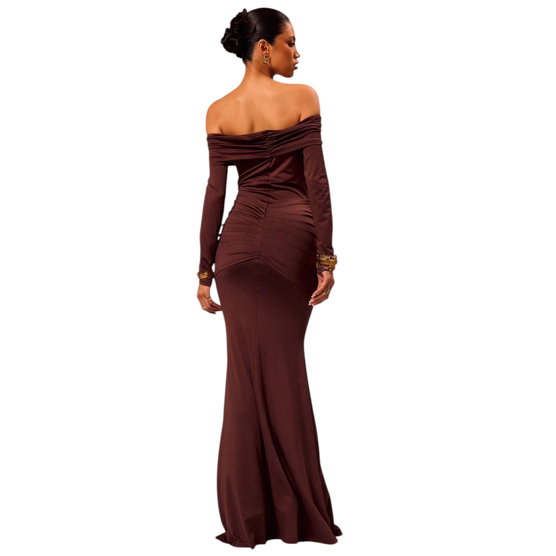 Címke nélküli, barna, ejtett vállú, hosszú ujjú, húzott részletű, maxi ruha fém díszítéssel.