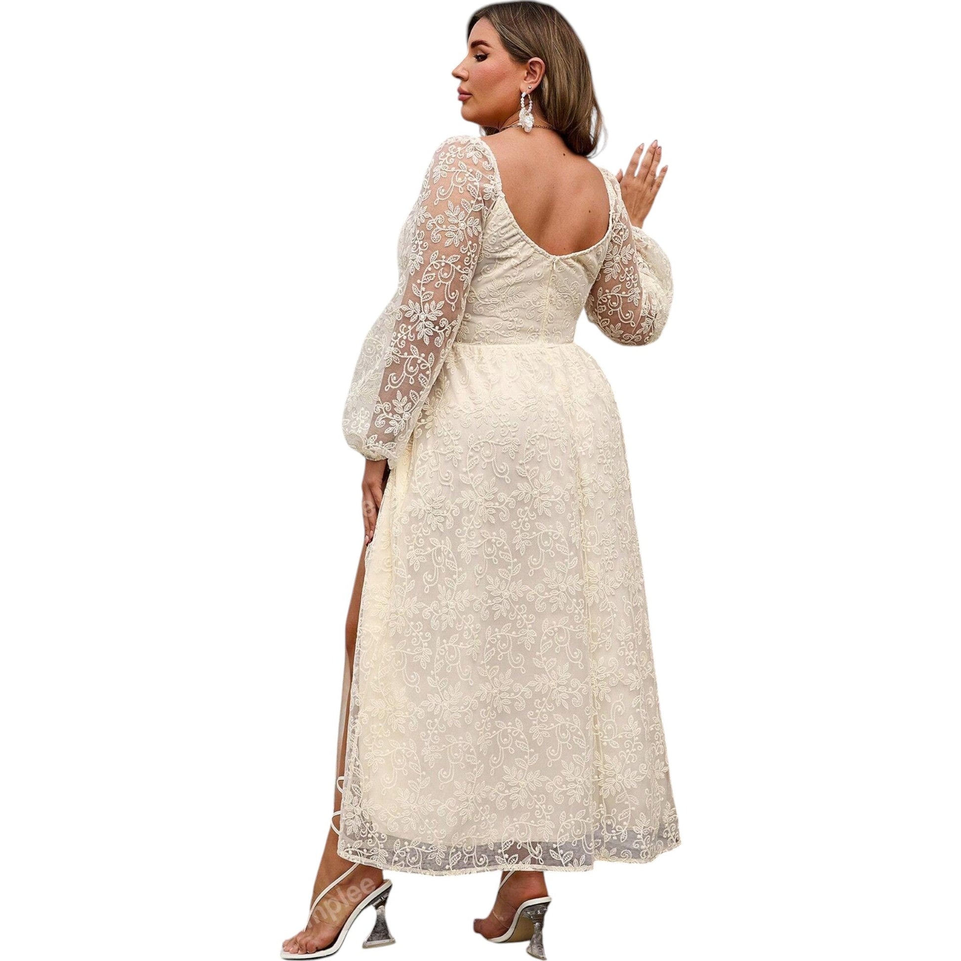 Címke nélküli, törtfehér, csipkés, V-nyakú, hosszú ujjú, hasított maxi ruha.