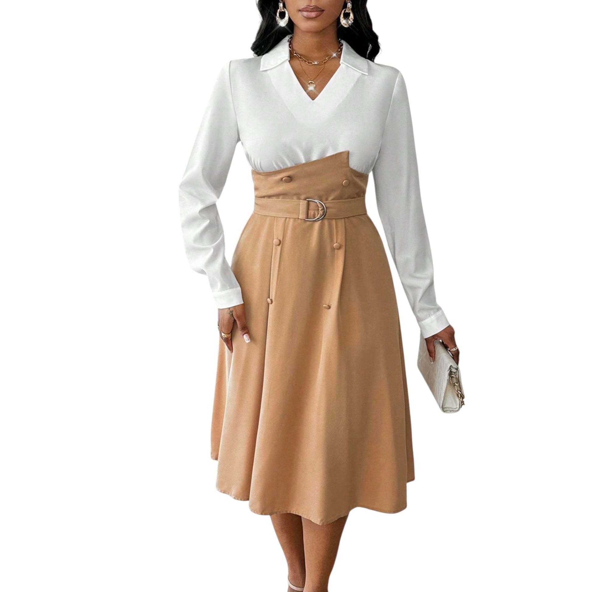 Címke nélküli, bézs és fehér, hosszú ujjú, V-nyakú, galléros, öves midi ruha.